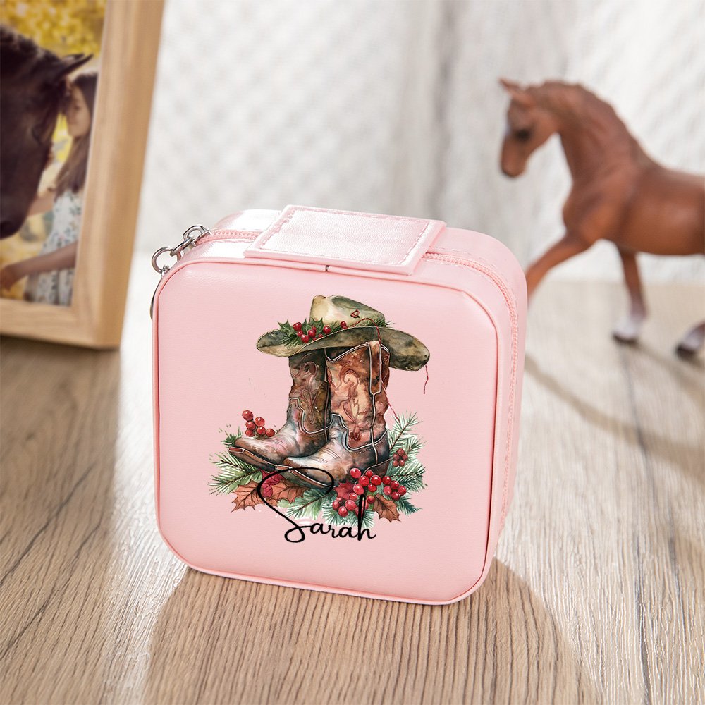 This leather travel jewelry case showcases a captivating design that combines the charm of cowgirl boots and a stylish hat, enhanced with personalized birth flowers. The thoughtful layout not only highlights the unique aesthetics but also ensures functionality. Each case can be customized with the recipient's name, adding a personal touch that transforms it into a one-of-a-kind gift.