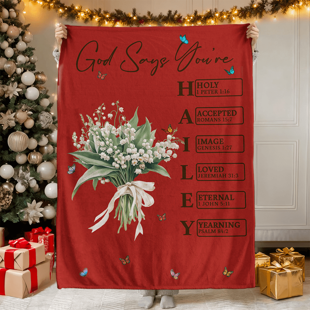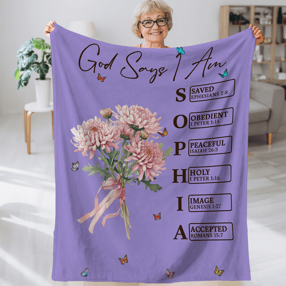 This unique blanket features beautiful birth flower patterns and inspiring Bible verses, symbolizing God's love and affirmation for you. It is printed with phrases like "God says I am united," "blessed," "chosen," each accompanied by corresponding Bible verses to convey messages of warmth and encouragement. Additionally, the blanket offers a custom name, making it a truly one-of-a-kind personalized item that reflects your faith.