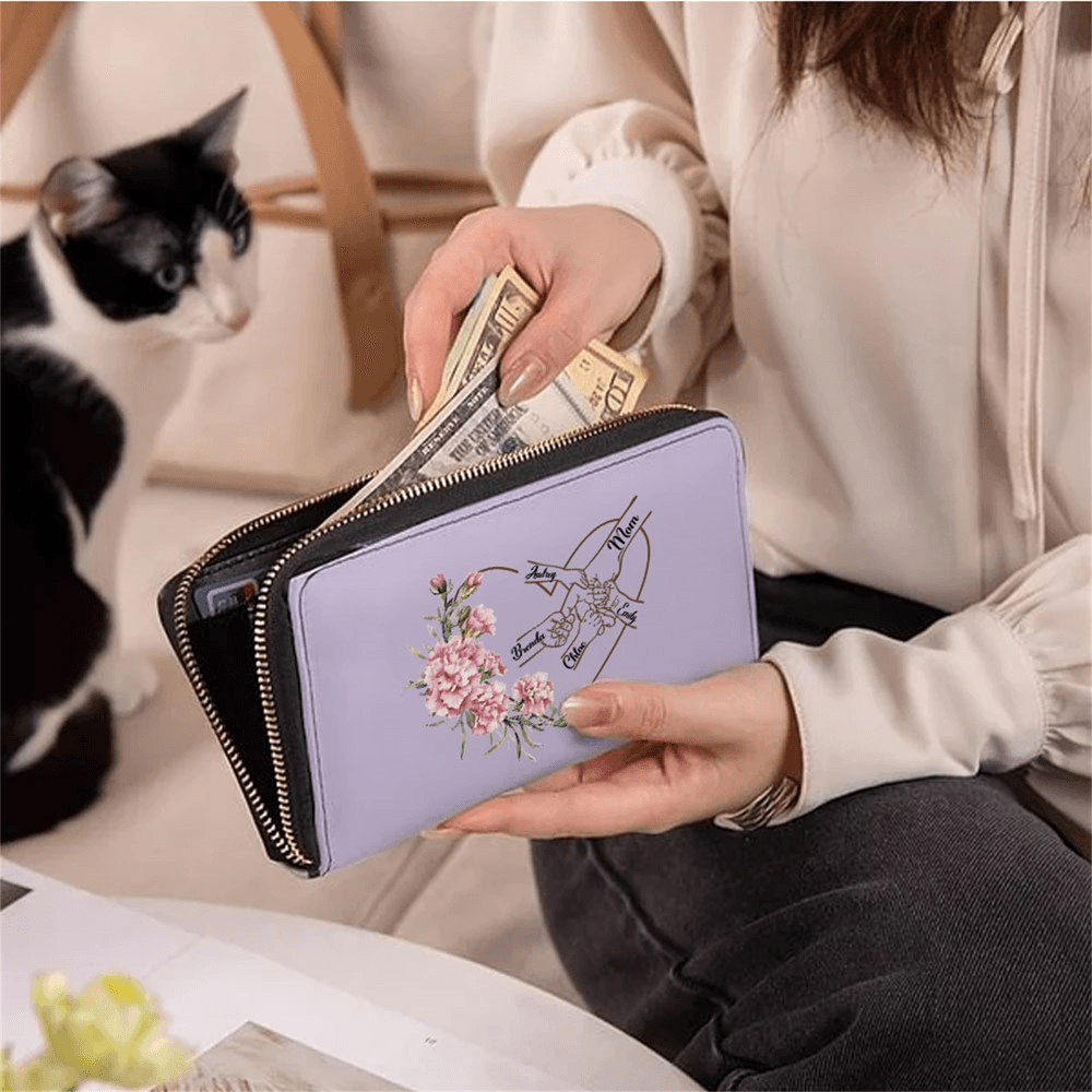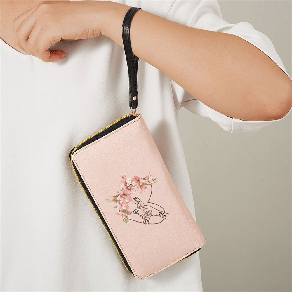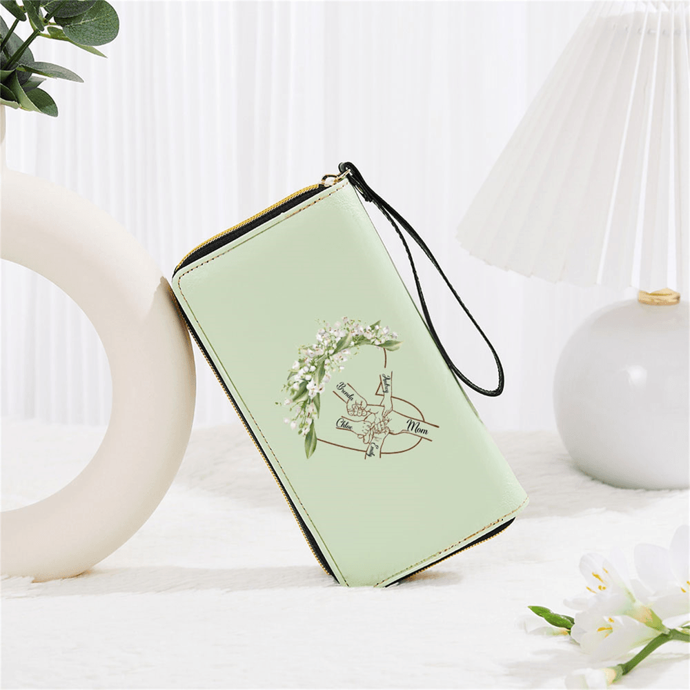 Our wallet centers on a warm heart-shaped handshake motif paired with elegant birth-flower illustrations, creating a comforting, meaningful appearance. It offers personalization with the mother’s name plus 1–6 children’s names, making each wallet a one-of-a-kind keepsake. The wrist strap balances portability and elegance, and the overall silhouette conveys family warmth with a modern aesthetic.
