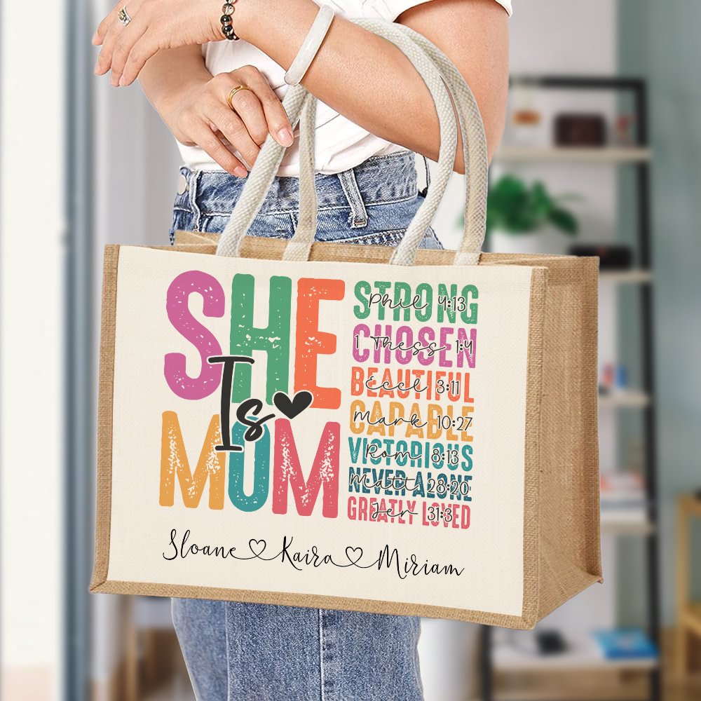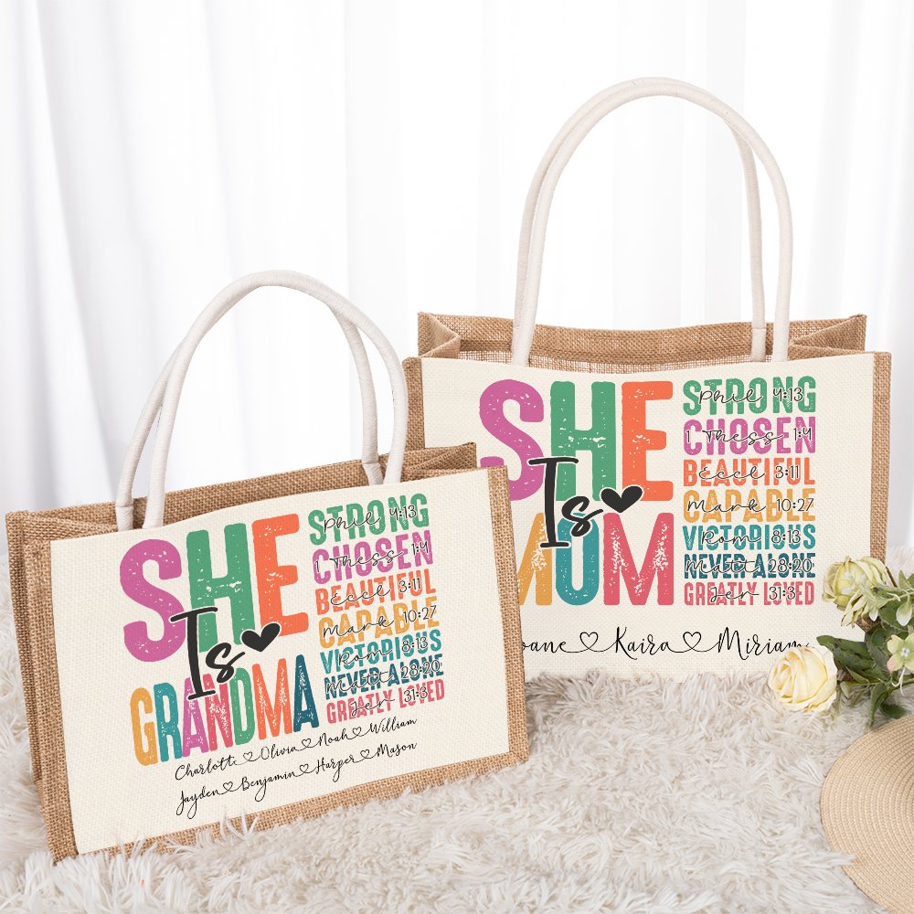 Our personalized jute canvas tote bag is a charming accessory for your beloved mom or grandma. The colorful words (such as strong, chosen, beautiful, etc.) express your admiration and blessing for your mother or grandmother.