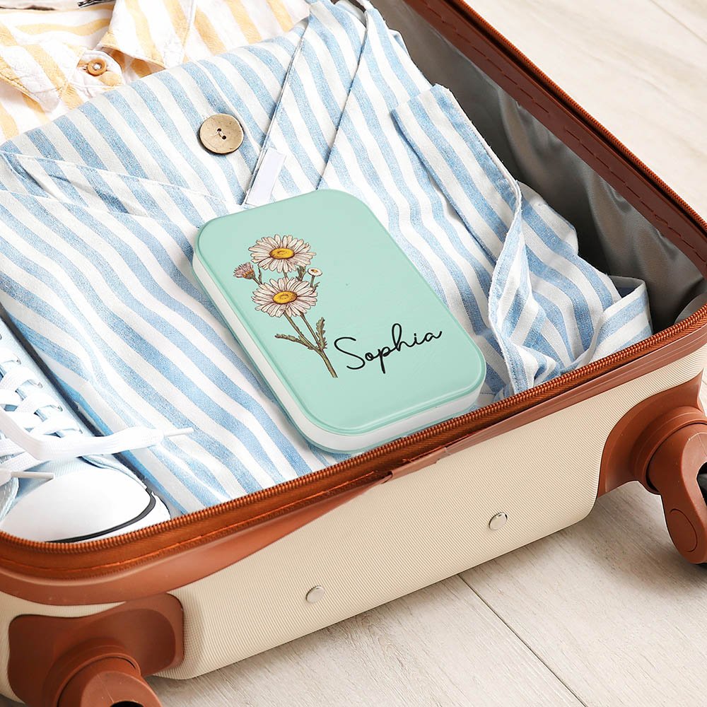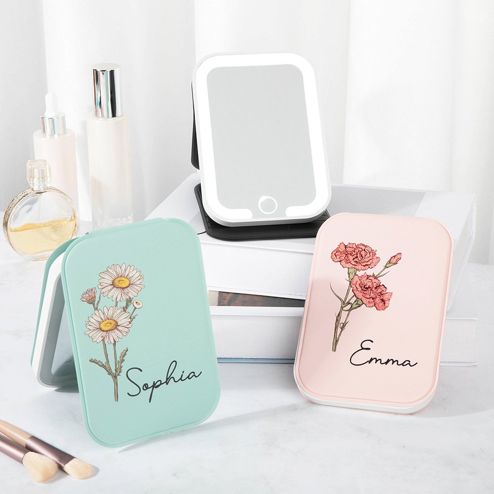 This makeup mirror features exquisite watercolor birth flowers and can be personalized with the recipient's name. This customization adds a heartfelt touch, transforming it into a cherished gift.