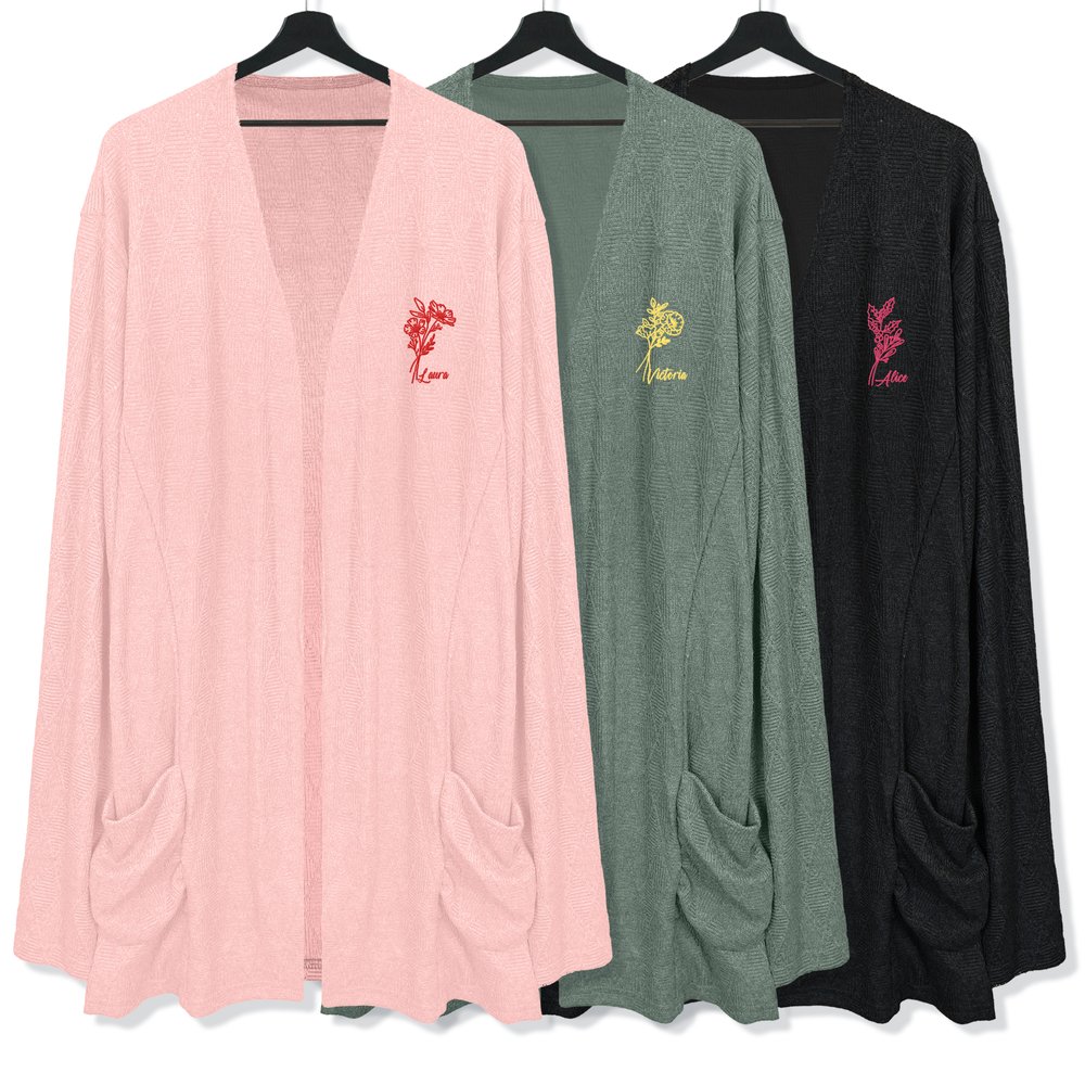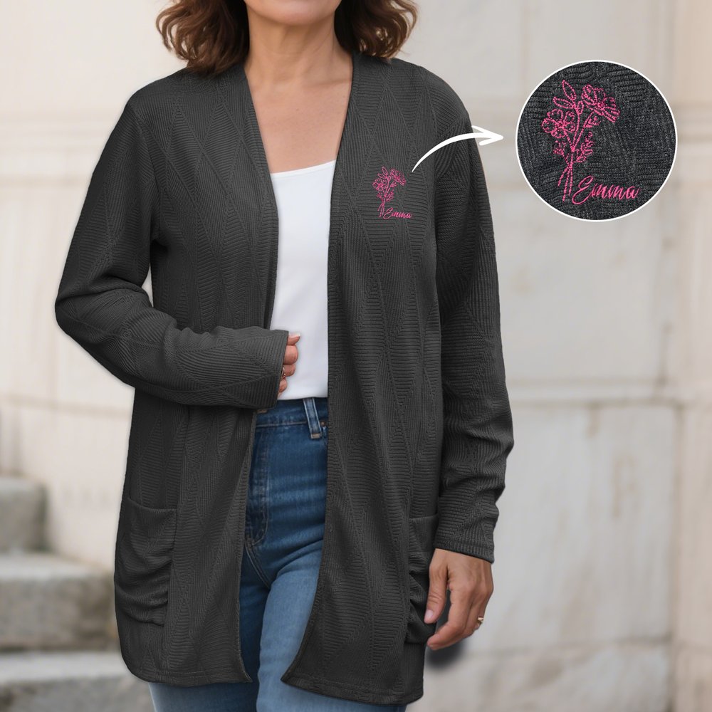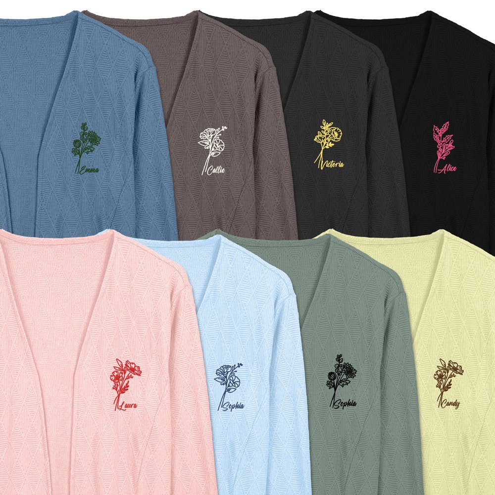 This cardigan sweater features custom embroidery of the birth flower plus names. The delicate floral embroidery and personalized names add a unique touch, making each piece one-of-a-kind.
