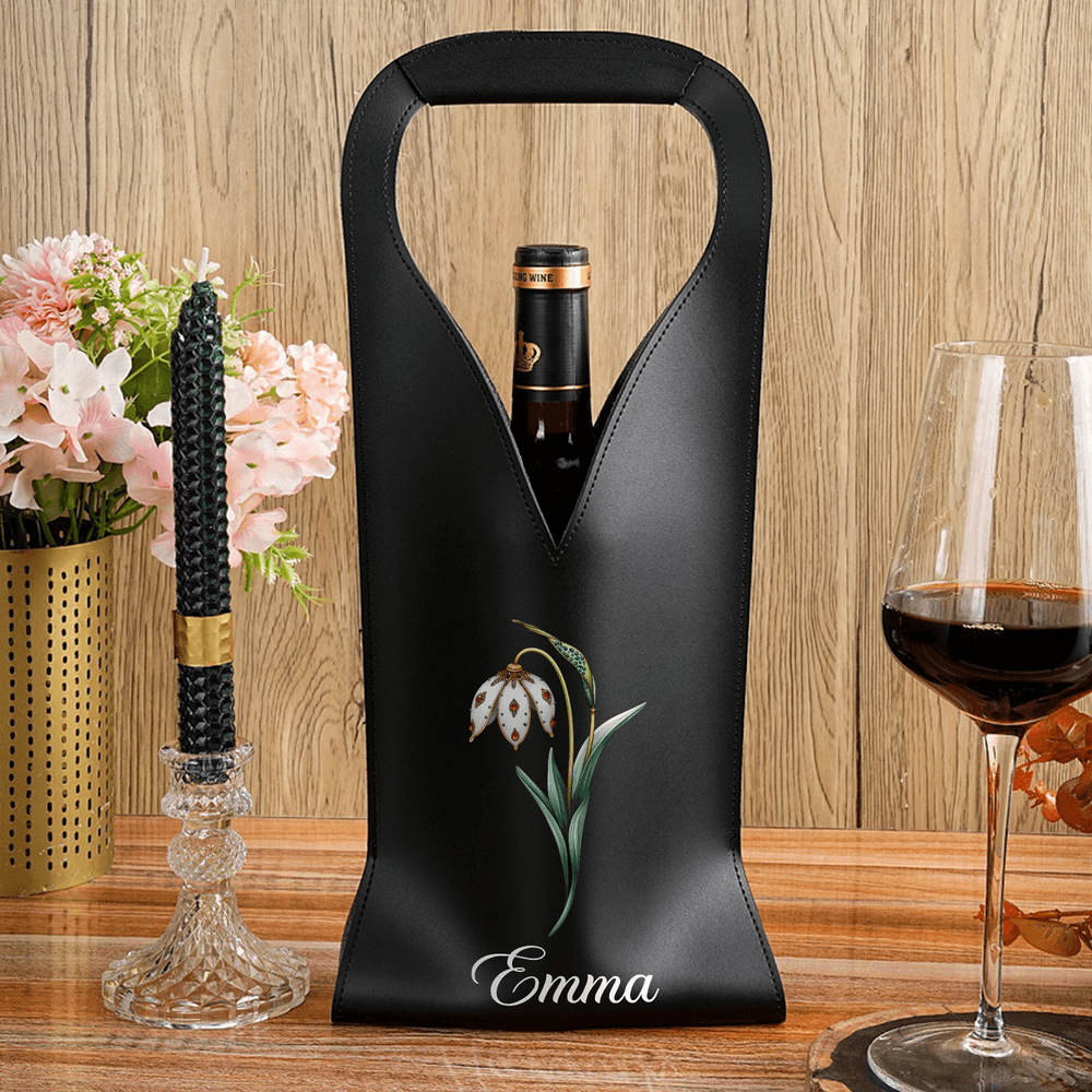 Personalized Birth Flower PU Leather Wine Bag with Name and Handle Protective Wine Accessories Birthday Gift for Wine Lover