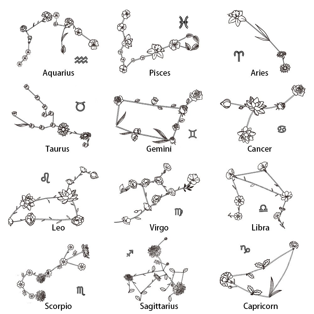 Aquarius: Carnation & Violet; Pisces: Violet & Daffodil; Aries: Daffodil & Daisy; Taurus: Daisy & Lily of the Valley; Gemini: Lily of the Valley & Rose; Cancer: Rose & Water Lily; Leo: Water Lily & Poppy; Virgo: Poppy & Morning Glory; Libra; Cosmos & Morning Glory; Scorpio: Cosmos & Chrysanthemum; Sagittarius: Chrysanthemum & Holly; Capricorn: Holly & Carnation.