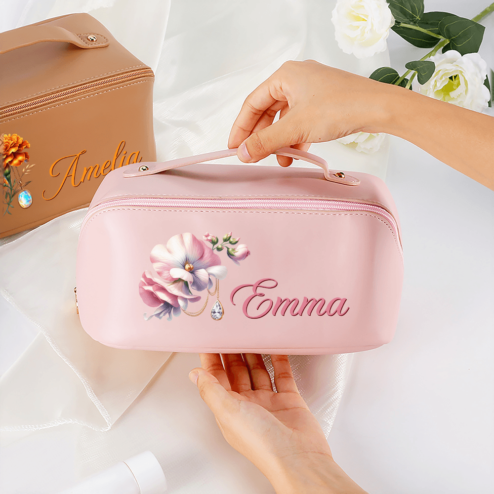 This exquisite makeup bag is beautifully adorned with a design that combines your unique birth flower and birthstone, creating a deeply personal symbol of identity and beauty. Each piece can be customized with a name, making it a truly one-of-a-kind accessory that celebrates individuality.