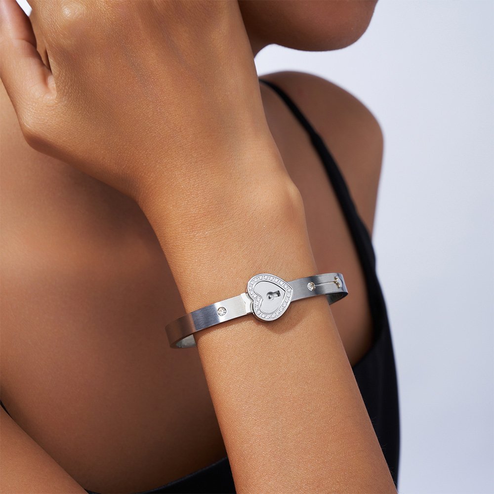 The necklace is shaped like a key, which means "opening the door to the heart", echoing the heart-shaped lock on the bracelet, conveying the combination of love and faith. The cross design not only highlights religious beliefs but also implies protection and hope. The birthstones on both sides of the bracelet can be customized according to the birthday month, and the text can be engraved on the inside, representing a unique personality and blessing.