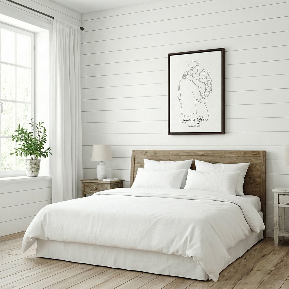 These paintings feature a minimalist black and white line drawing style. Customizable text is available at the bottom, and two formats are available: wrapped canvas prints and floating frame canvas prints. The design is simple yet highly artistic. The image seamlessly extends around the edges for a clean, 3D minimalist look—ideal for a sleek, contemporary aesthetic.