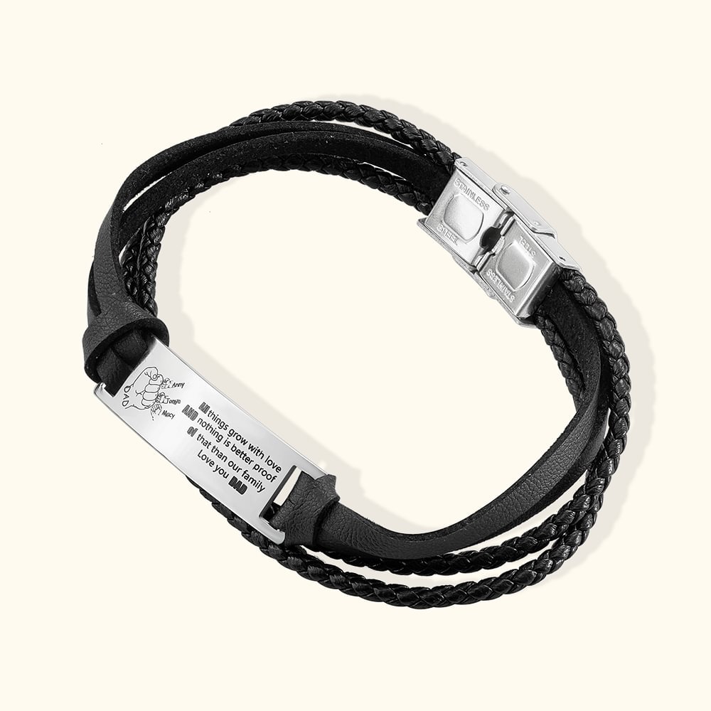 The leather bracelet for men is a great way to express your gratitude and love for your special person. You can choose the pattern fist or foot and the inspiring words on the stainless steel bar,what's more, names engraved on stainless steel metal can show your love or thanks for father. This bracelet makes up for a perfect everyday accessory for men.