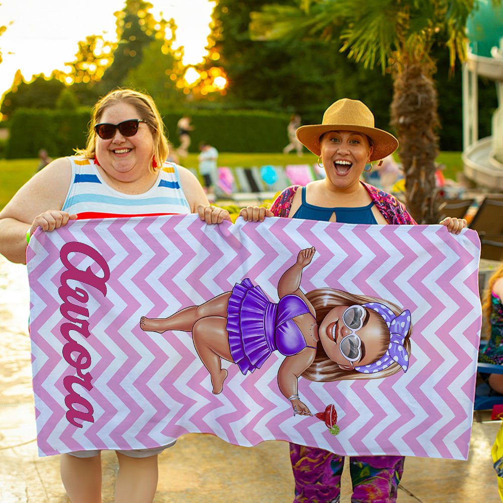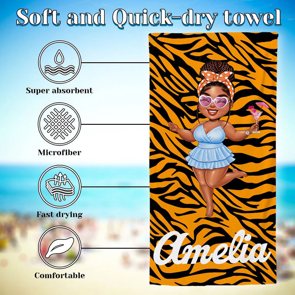This vibrant beach towel features a multi-color cartoon image of a black woman or girl that can be personalized with a name. Each beach towel can be personalized and named, transforming it into a thoughtful and unique gift that reflects the recipient's identity and personal style.