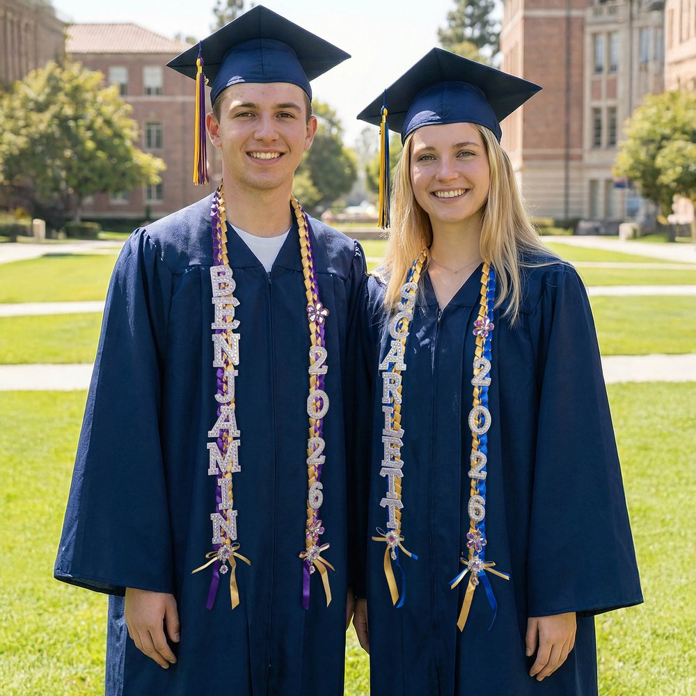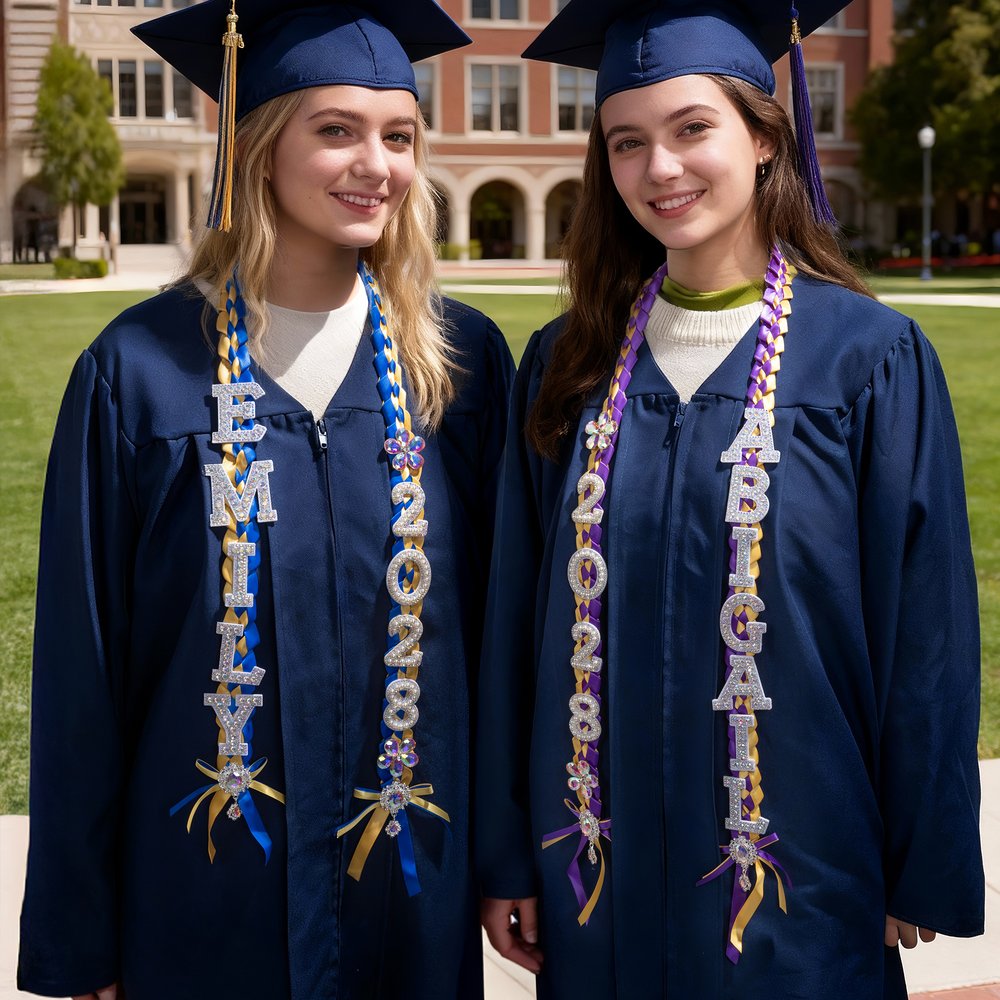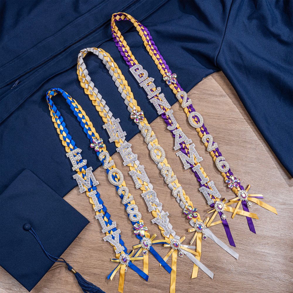 The intricate braiding of the two-colored ribbons creates a visually captivating pattern that immediately catches the eye. Each lei is adorned with dazzling rhinestones and delicate flower embellishments, adding a touch of glamour and sophistication. But the real show-stopper is the custom-made pearl letters spelling out the graduate's name and the class of 2026!