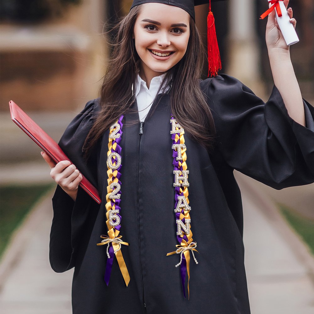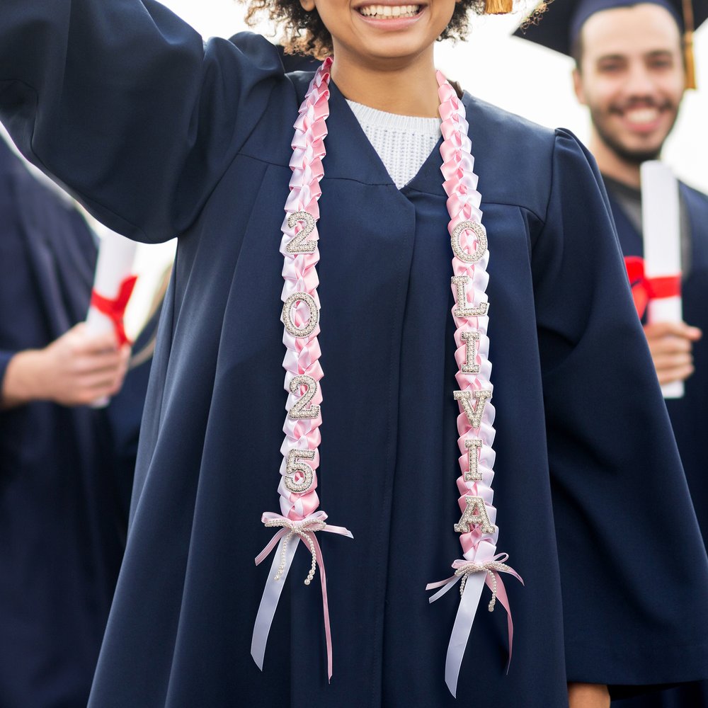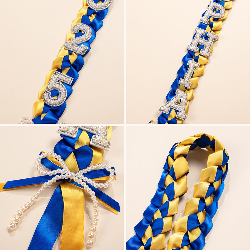 The intricate weaving of ribbons in two colors creates a visually captivating pattern that immediately catches the eye. Each lei is embellished with delicate bow accents, adding a touch of sophistication. But the real eye-catcher is the custom-made pearl letters spelling out the graduate’s name and year.
