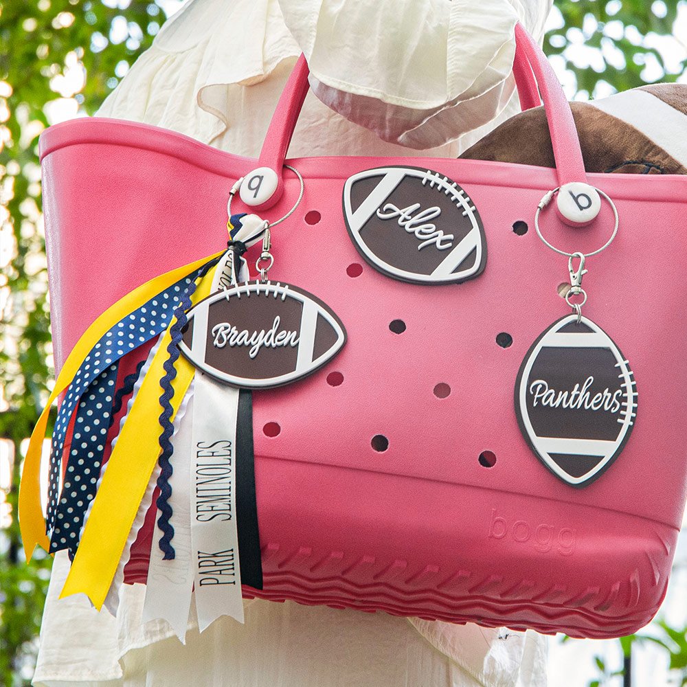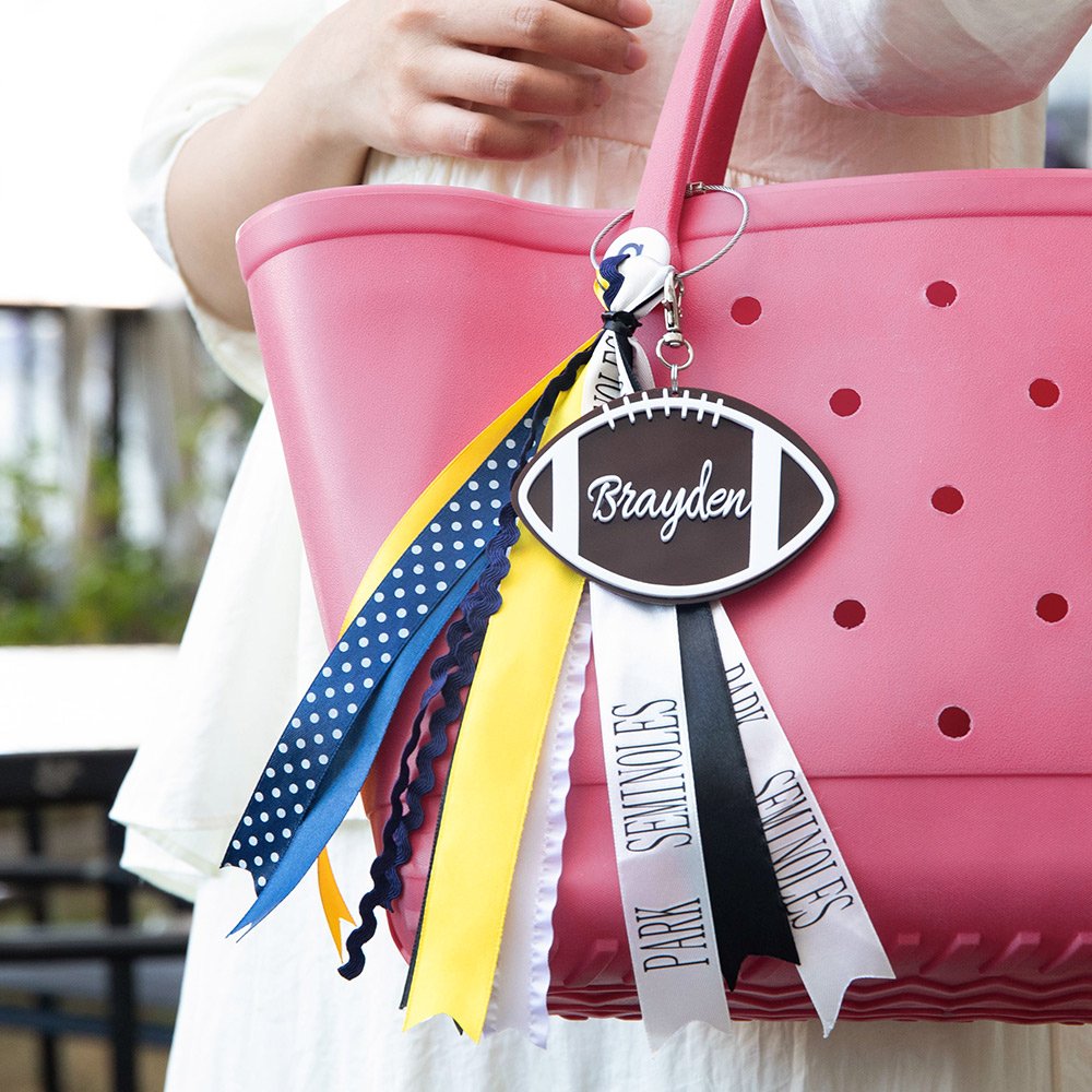 There are 3 options on this listing(flush mount charms, charm only, charm with ribbons ). Flush mount charms are only for bags, they have a button on the back to pop the charm into one of the holes on the bag (3 inches). Charm only is a charm with a swivel hook attached. These are perfect for your kid's sports bags or clipped onto a bag. Charm with ribbons comes as you see in the first photo with the 3-inch football charm with an assortment of ribbons. It includes 1 custom printed ribbon that can say anything you want!