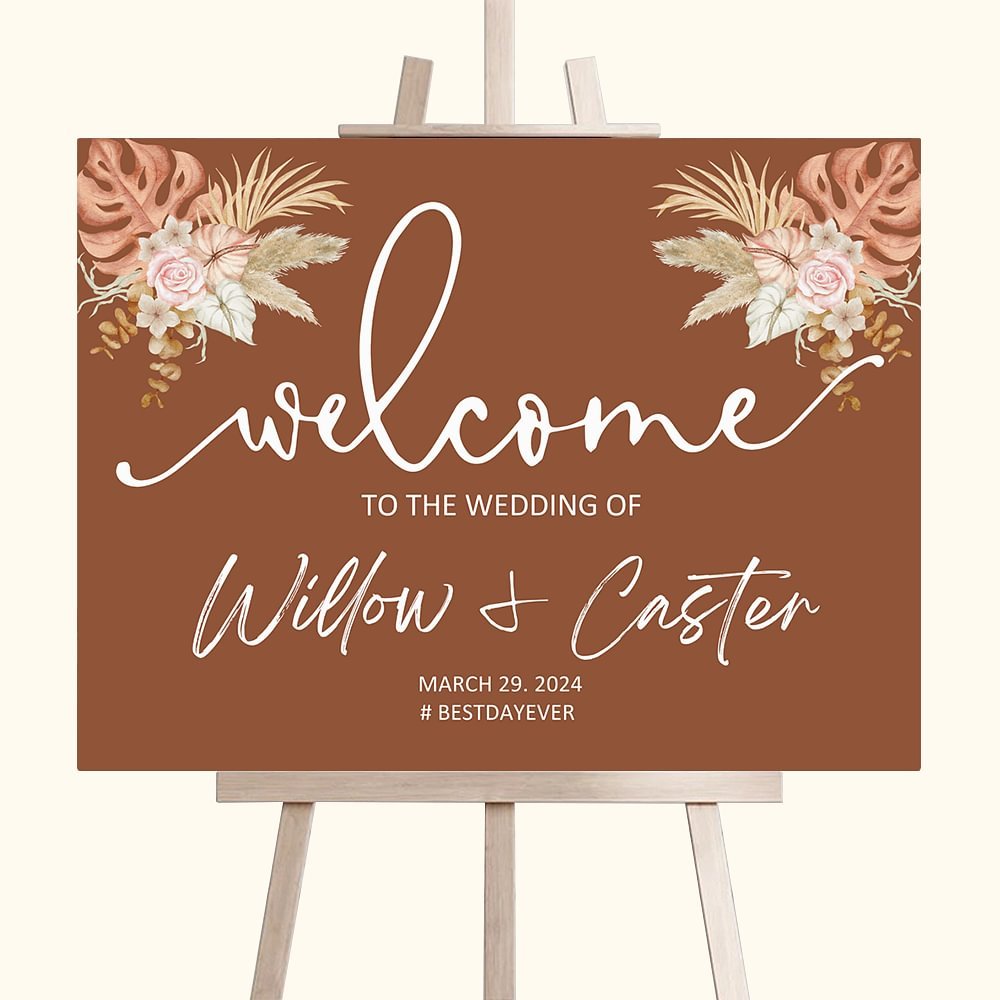 This personalized wedding welcome sign features a beautiful bohemian rust floral design that perfectly captures the essence of a fall wedding. The intricate detailing and vibrant colors of the flowers create a visually captivating piece that will add a touch of elegance to any wedding decor.