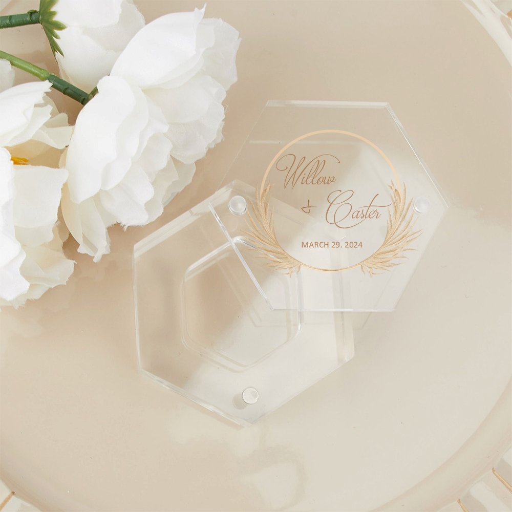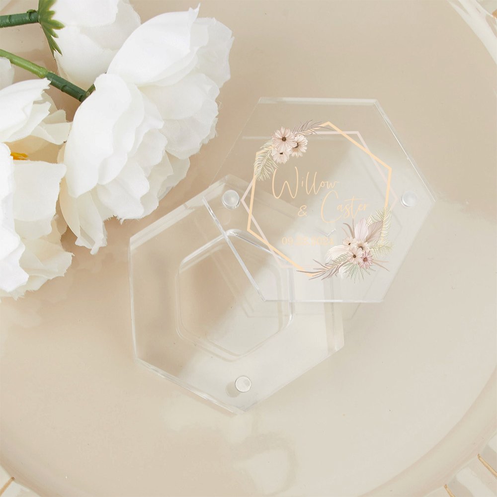 Made from high-quality acrylic, it features a clear construction that allows the beauty of your rings to shine through. The magnetic closure ensures that your rings are securely held in place while adding metallic feel to the overall look. The personalized printing on the lid adds a sentimental touch, making this ring box truly one-of-a-kind.