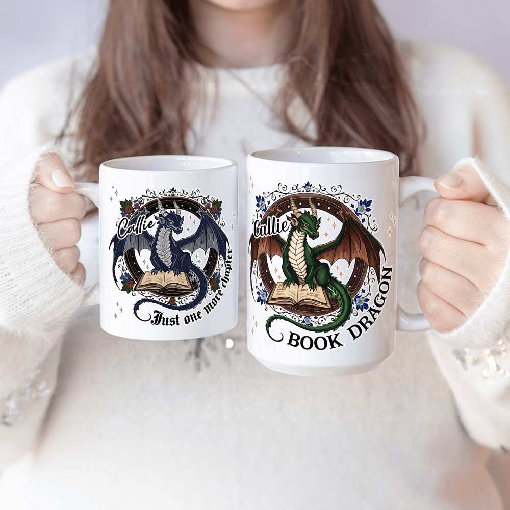 Choose from six mug colors and beautifully detailed Book Dragon artwork. Each design features a dragon curled atop stacked books, accented with vintage patterns, star-like speckles, and floral elements. Select one of two reader-favorite quotes—“Just One More Chapter” or “Book Dragon”—and add a custom name to create a truly one-of-a-kind mug made just for you.