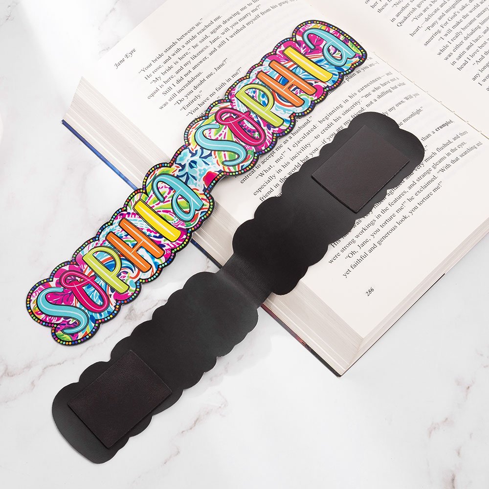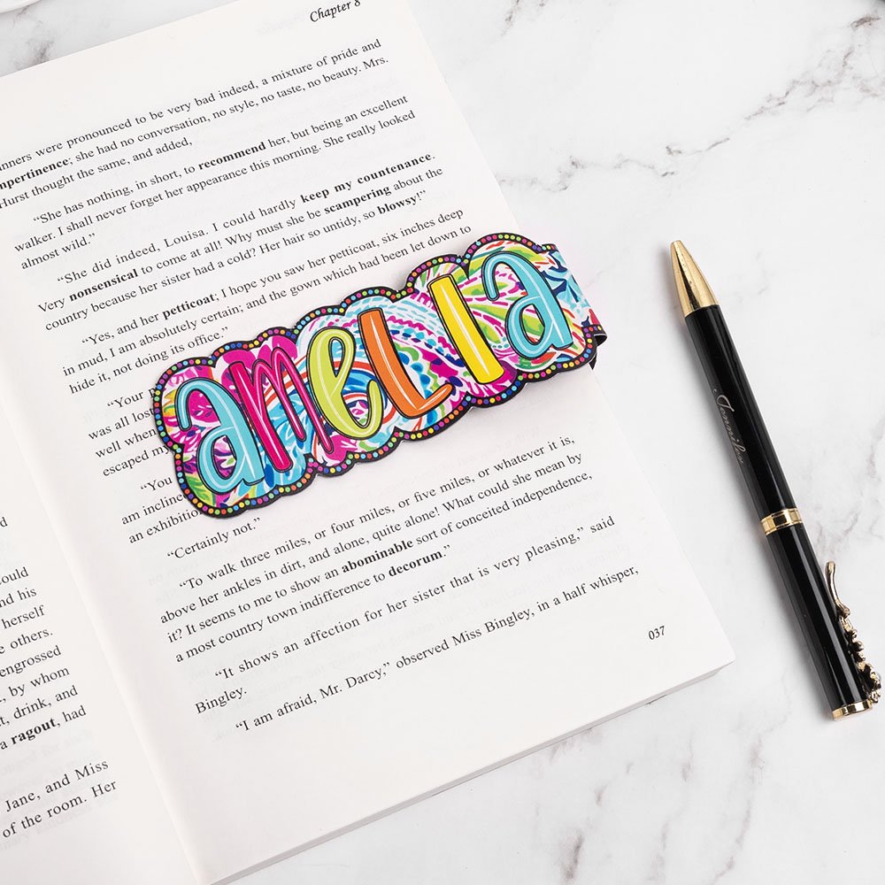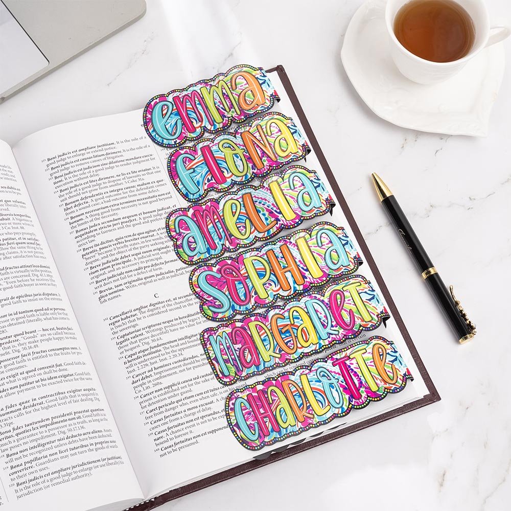 The paisley motifs are intricately detailed, with a mix of bright colors like pinks, blues, greens, and yellows, which make the bookmarks stand out against the pages of any book. The colorful floral designs and personalized names give these bookmarks a unique and cheerful appearance. Each bookmark features large, bold letters spelling out names, making them highly personalized.
