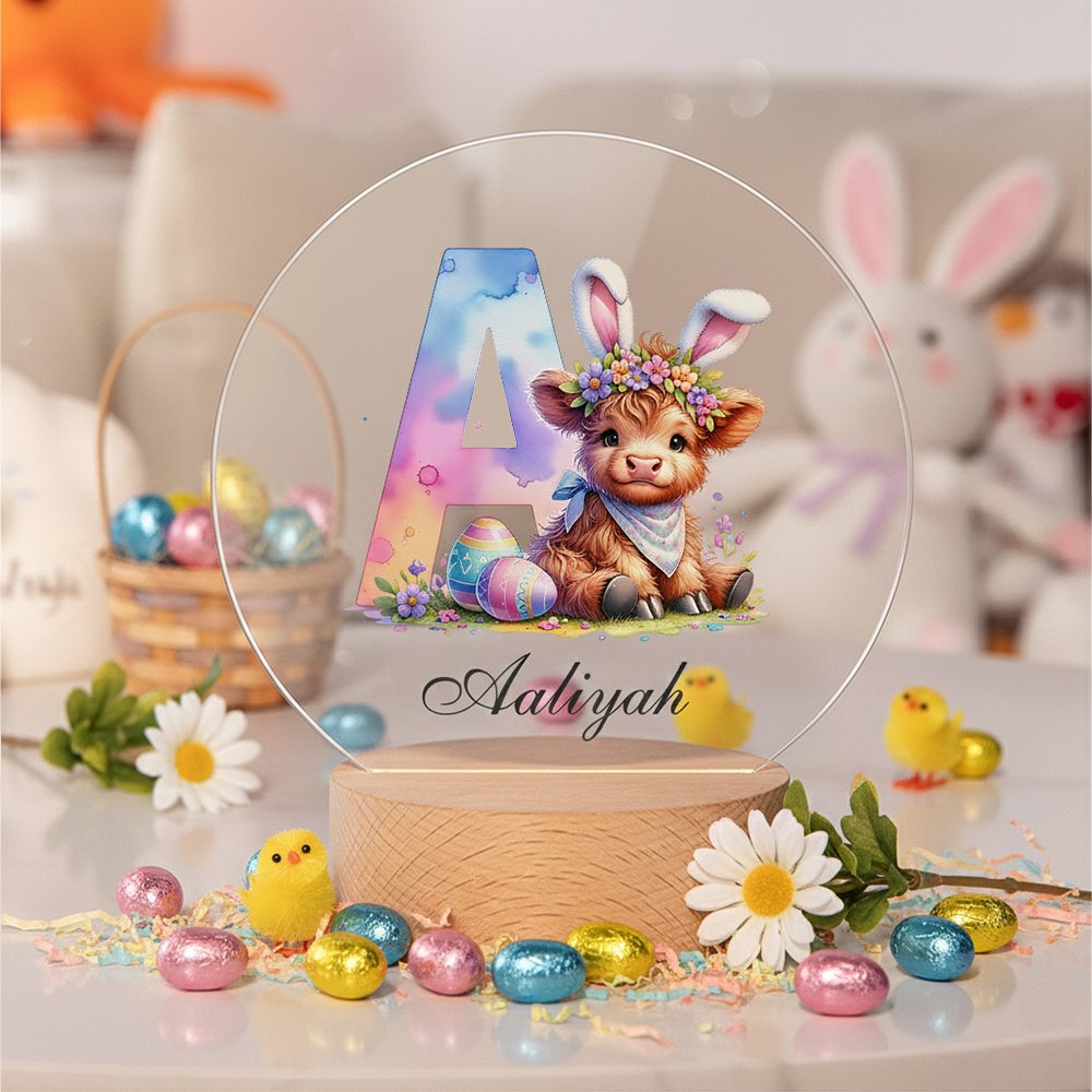 This night light features an Easter theme, incorporating festive elements such as Highland cows, bunny ears, and Easter eggs to create a playful and whimsical scene. Customization with your child's name is available, making each light a unique decorative piece that adds a joyful touch to any child's room.