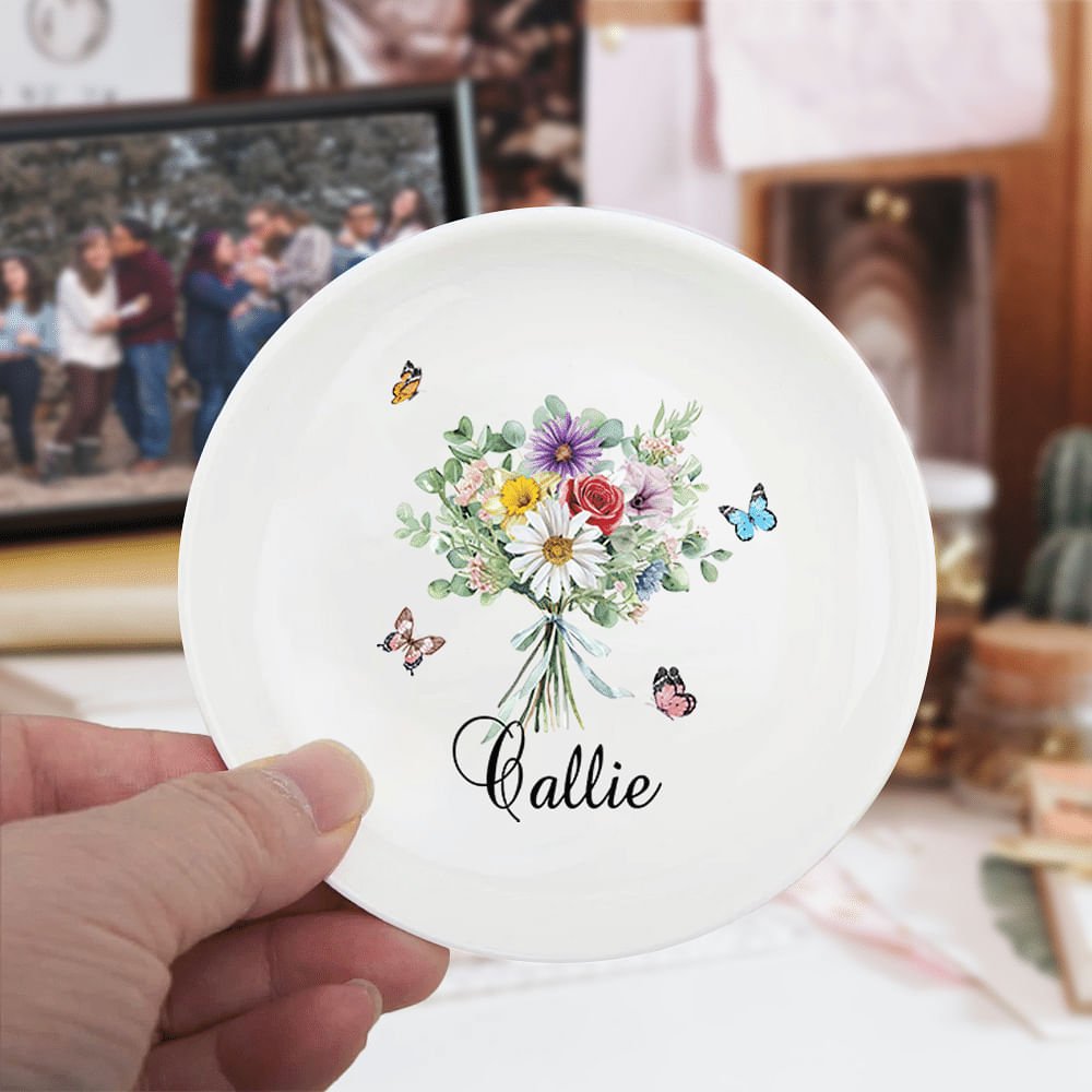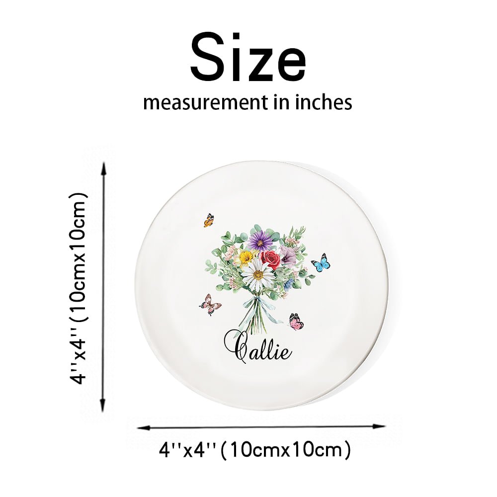 Introducing this charming ceramic jewelry dish - the perfect blend of elegance and practicality! This jewelry dish is the ideal decoration for any room, featuring a vibrant birthday bouquet pattern that can be combined according to the birth month of family members and surrounded by colorful butterflies. You can also customize it with your name, which shows elegance and personality to the fullest.