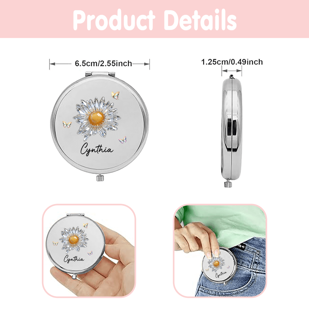 This exquisite compact mirror showcases a beautiful combination of personalized crystal birth flowers, elegant butterflies, and custom names, making it a truly unique accessory that reflects individuality and femininity. Designed for both durability and style, this makeup mirror features dual magnification options (1x and 2x), ensuring you can achieve the perfect look with precision.