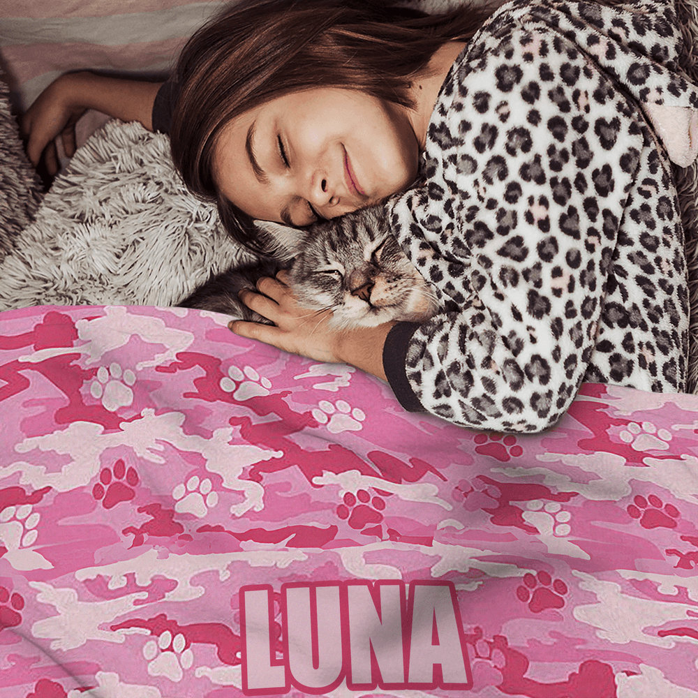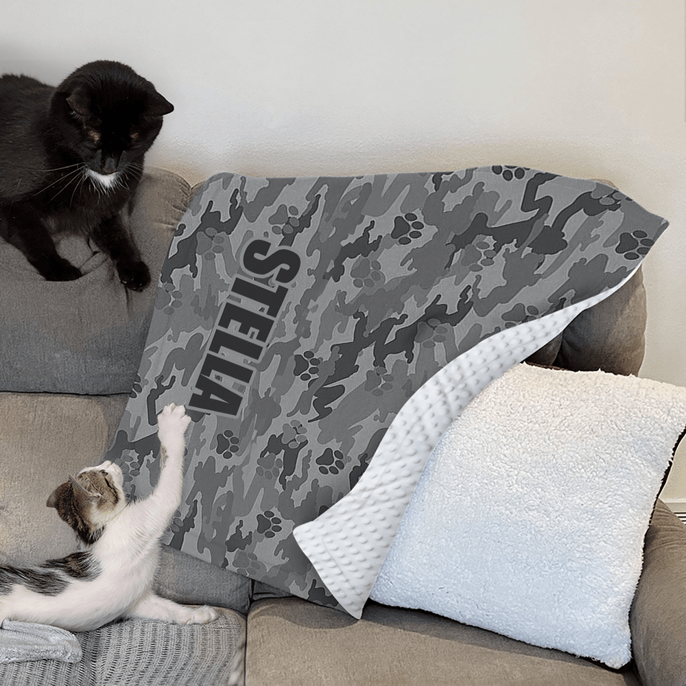 Featuring a camouflage pattern base accented with playful paw prints, giving the overall design a stylish and modern feel. The surface supports customization with your pet's name, blending personalized identity with distinctive patterns to create an intimate keepsake that belongs uniquely to you and your pet.