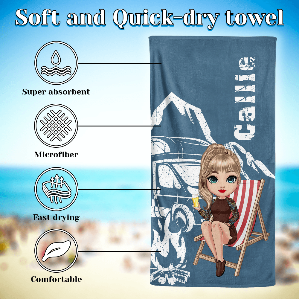 This beach towel artfully blends a cute cartoon camping character with classic silhouette elements like mountains, campervans, and campfires, adding an immersive outdoor camping vibe. The design transports you to a vibrant and relaxing wilderness, letting you fully savor the joy of a leisurely getaway. You also can customize it with your name, adding a personal touch to your outdoor adventures.