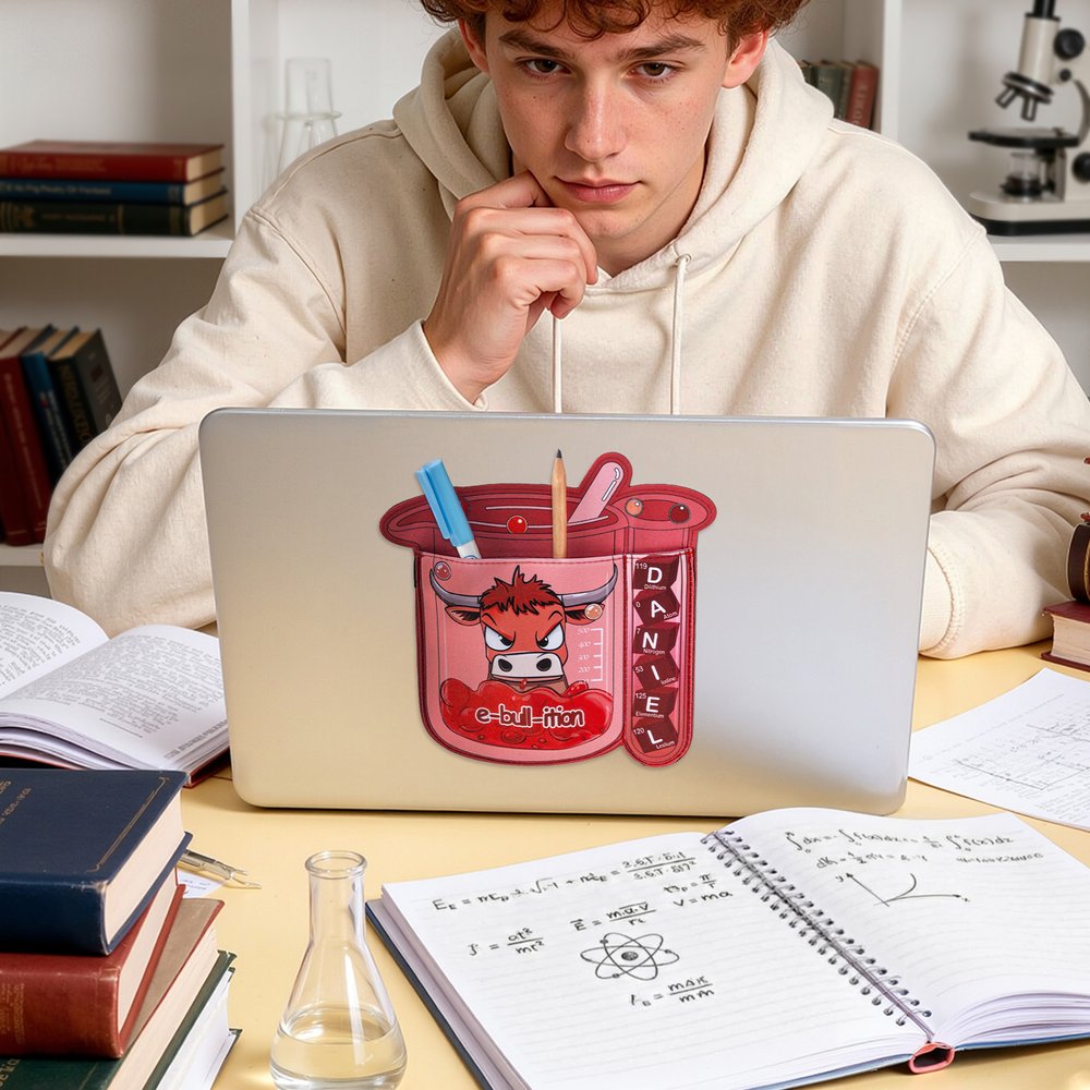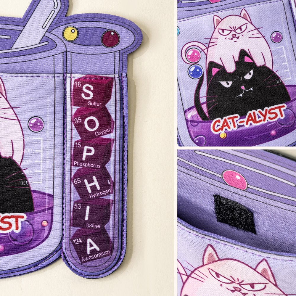 Featuring three delightful laboratory-themed animal characters - a cat, a bull, and a mole - each design brings scientific exploration to life. The pouch can be personalized with chemical elements, scientific puns and science jokes, symbols or formulas, creating a unique accessory that celebrates the wearer's favorite science subjects.