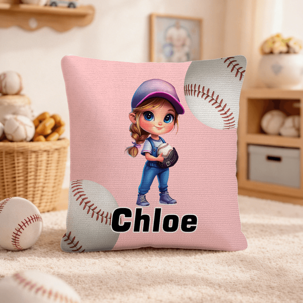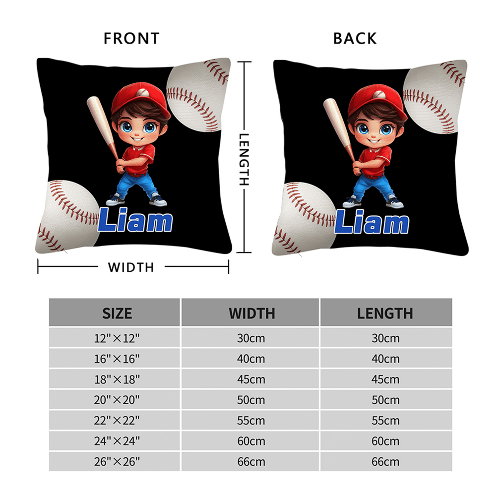 Featuring adorable cartoon baseball players, this pillow cover brings the thrill of the game to life—from winding up to swing to cradling a baseball in their glove. Customizable with a name and a variety of color options, it becomes a one-of-a-kind sports symbol for your child. More than just a decorative piece, it's a treasured keepsake that celebrates their love for baseball.