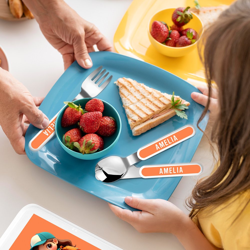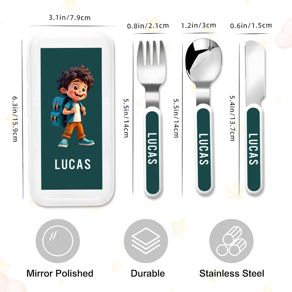 Personalized Cartoon Boy Girl Safe Stainless Steel Kid's Fork Spoon Knife 3 Pcs Cutlery Set with Case and Name Birthday Back to School Gift for Kids