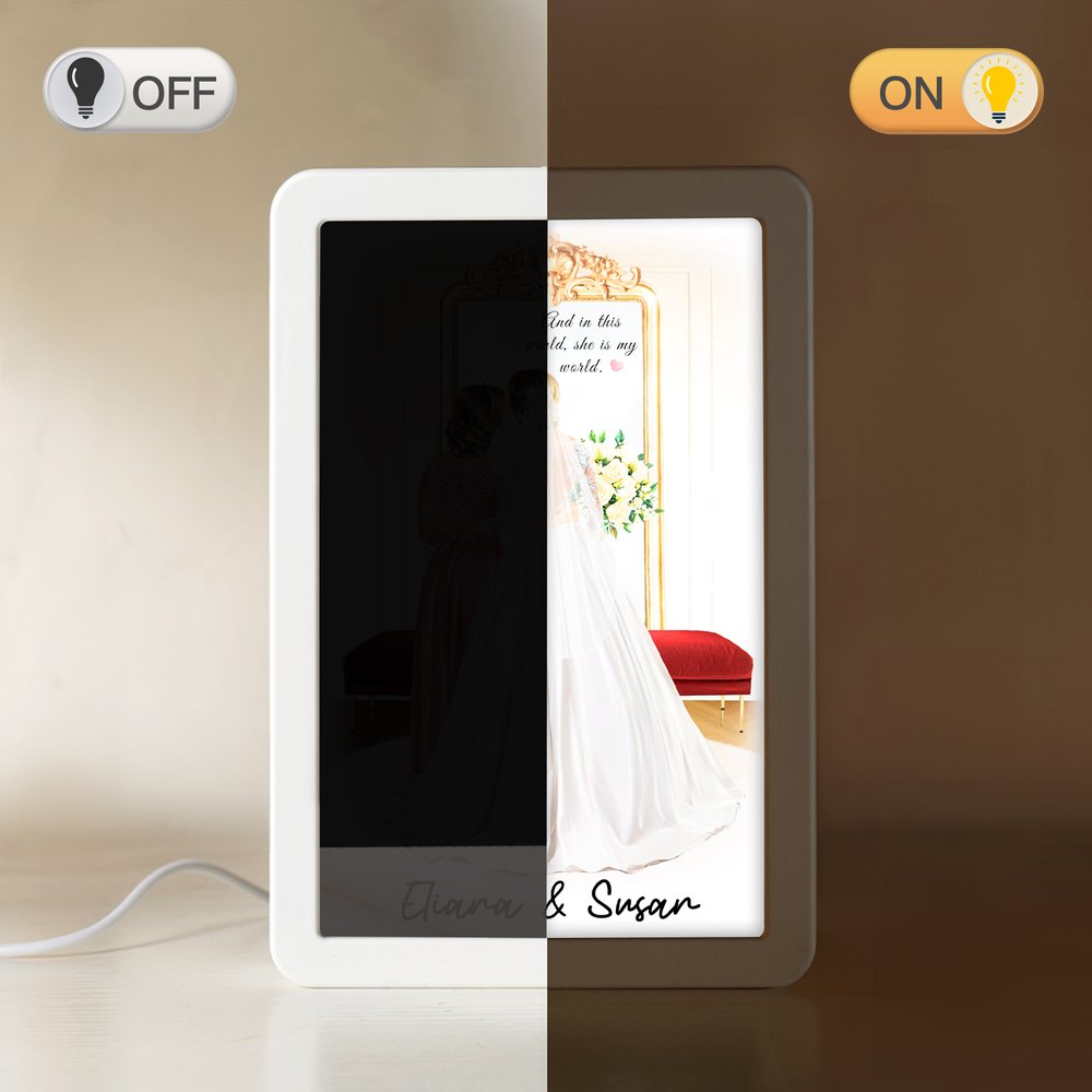 This photo frame mirror features a cartoon mother and bride design, with beautiful illustrations depicting unique characters and LED lights that create a soft and romantic atmosphere when lit. The bottom of the frame can be customized with your name, ensuring this gift is truly unique and personal.