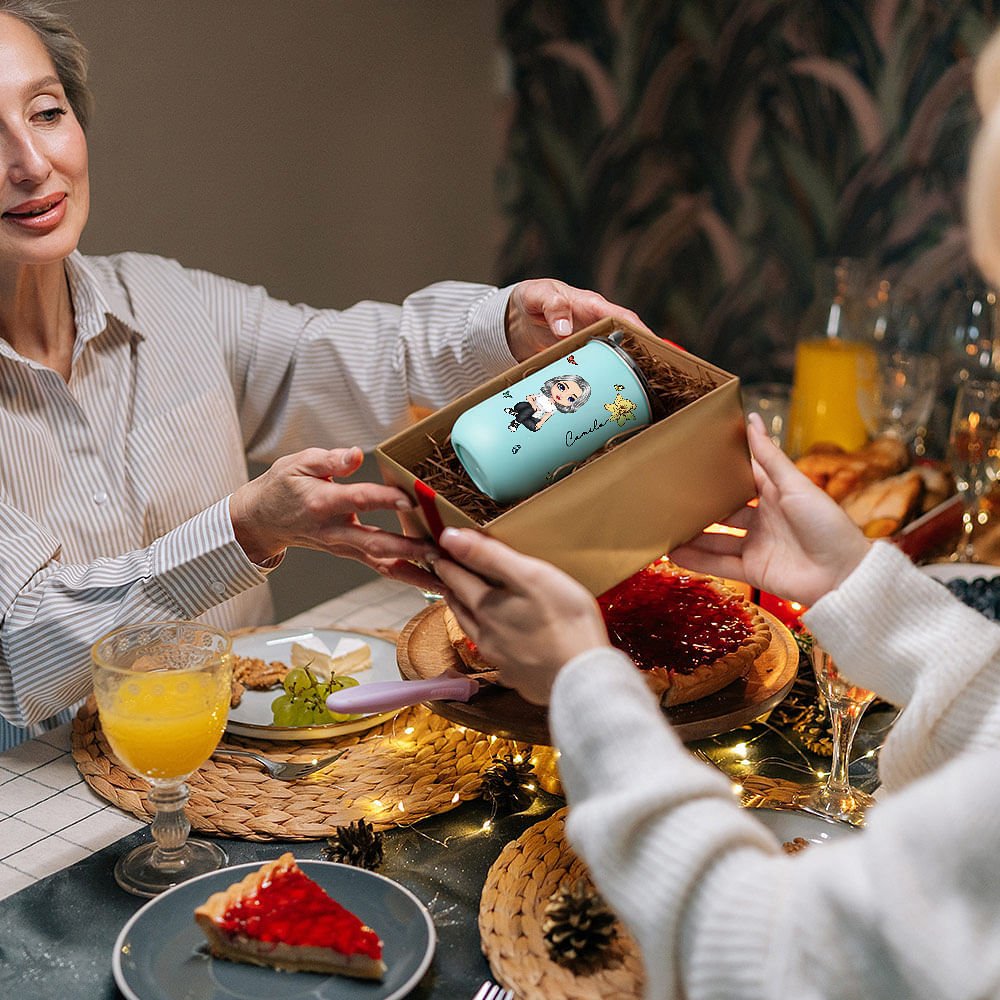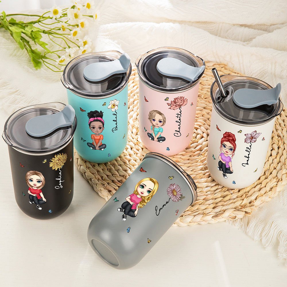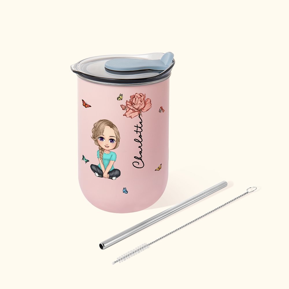 This coffee tumbler features a cute cartoon girl alongside the enchanting birth flower and name, making it a truly unique and cherished gift for women.
