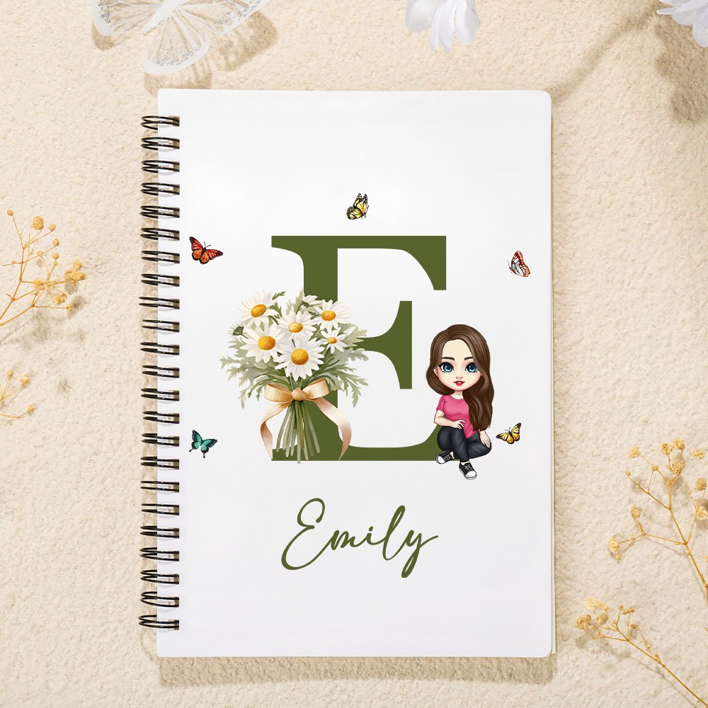 This exquisite notebook features a cover adorned with a birth flower bouquet design tailored to the recipient's birth month. The beautifully rendered floral print and cartoon character add a personal touch and a sense of nature's beauty to the journal. Enhance your writing experience with the option to add a matching ballpoint pen, designed in the same whimsical style as the notebook. This unique cover with a customized initial and name makes the notebook visually appealing and creates a meaningful connection between the user and their journal.