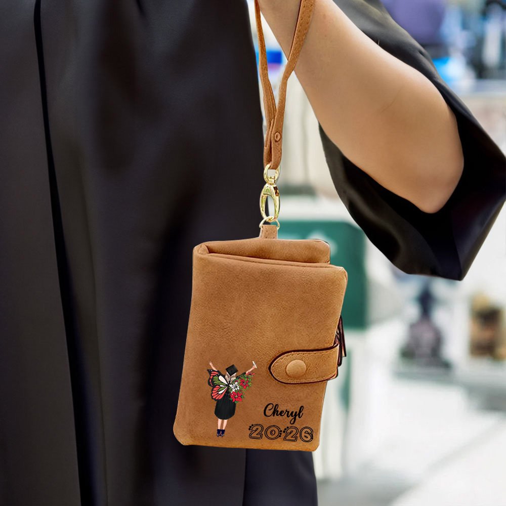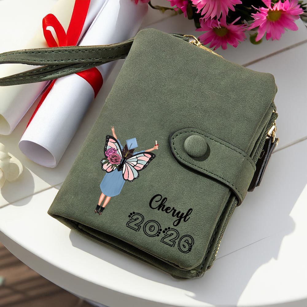 This wallet draws inspiration from a cartoon graduate wearing academic attire, paired with beautiful birthday flower butterflies. You can select the butterfly design that corresponds to your birth date. The wallet also allows you to customize it with your name and graduation year, creating a one-of-a-kind item.
