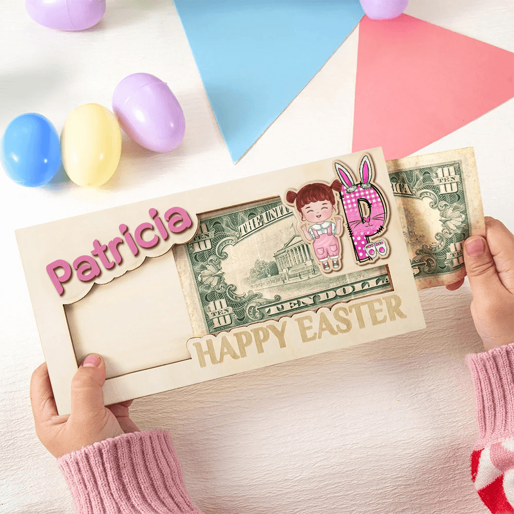 This charming Easter money holder features a playful design where your child's name, initials, and fun cartoon character clipart come together in a personalized and joyful style. Each piece is uniquely crafted to capture the spirit of the season with a touch of individuality.