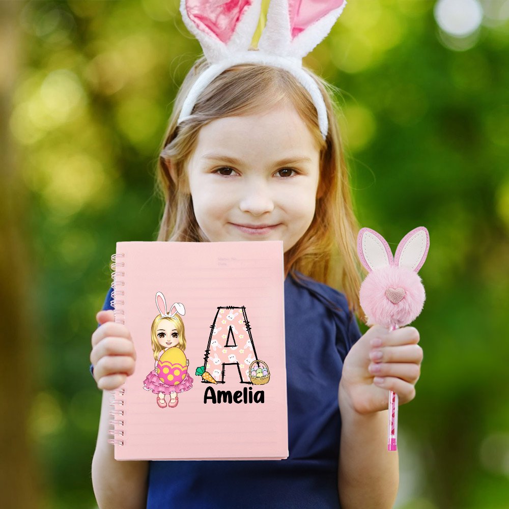 The cute Easter notebook and bunny bubble pen set can be customized with a cartoon character holding an Easter egg. Each notebook is individually equipped with a fluffy pen of the same color. The notebooks are available in a variety of colors and can be customized with names and initials.