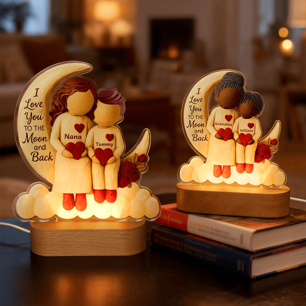 This enchanting night light features a whimsical scene of a moon and a cloud, accompanied by adorable cartoon images of a grandmother and grandchildren. The heartwarming design includes the phrase "I Love You to the Moon and Back," creating a touching piece that celebrates the bond between generations. You can also customize it with a name, enhancing its sentimental value.