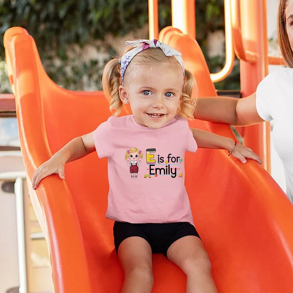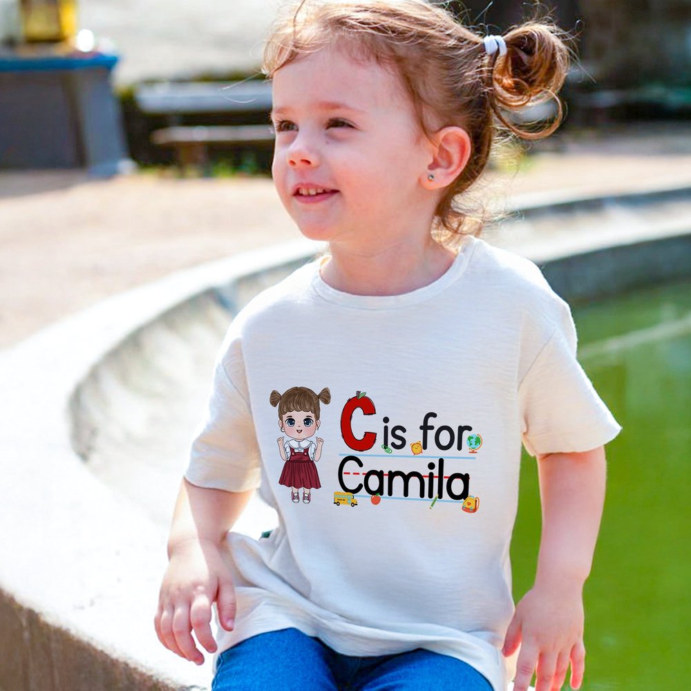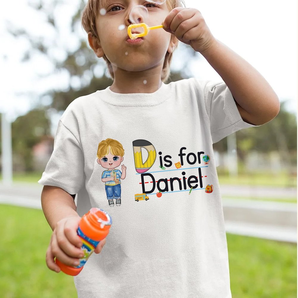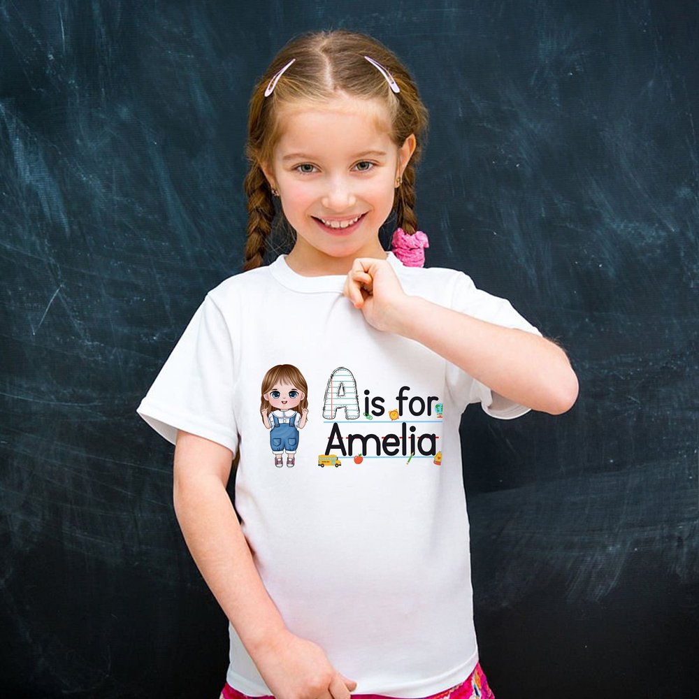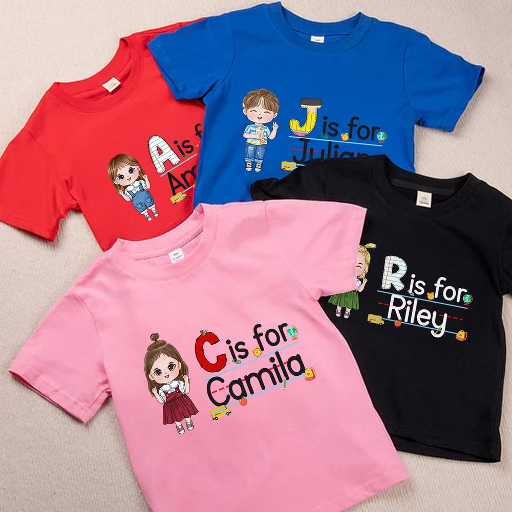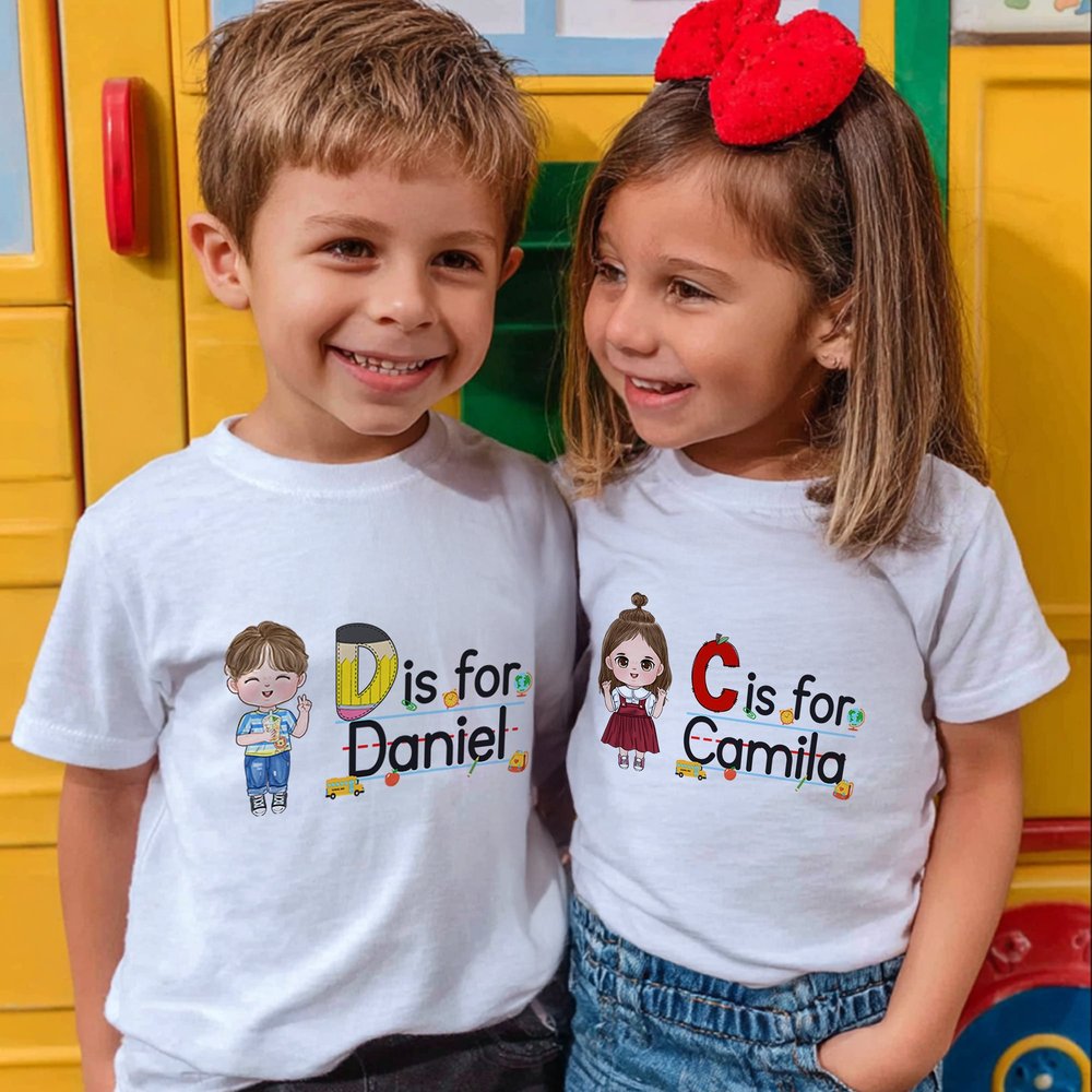 This kids' T-shirt features playful elements like a pencil, apple, and notebook, along with exclusive cartoon characters for boys and girls. It's lively and engaging, making it a favorite for kids. Names and initials can be customized to create a unique style just for your kid, making them an instant hit on campus!