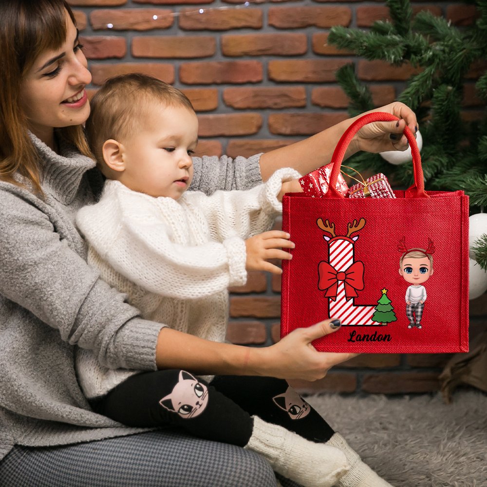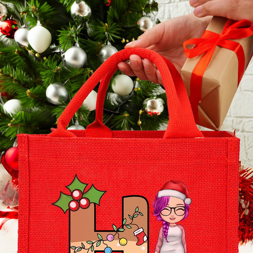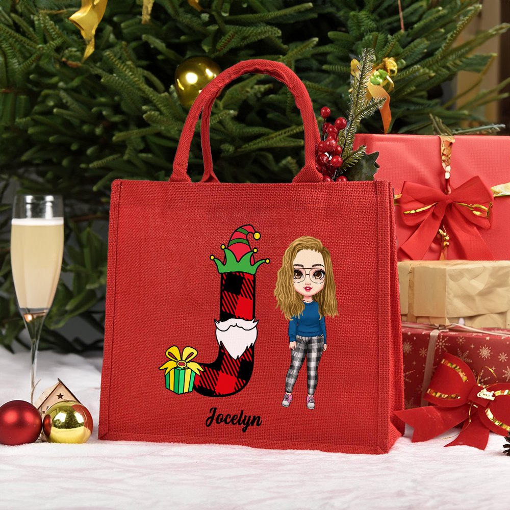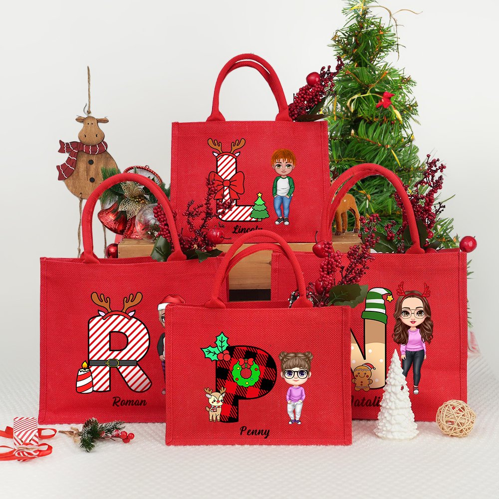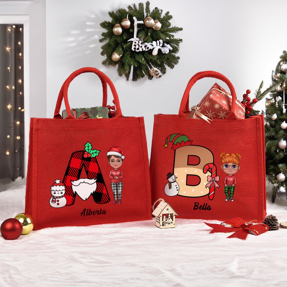 Each bag features a charming combination of cartoon characters and Christmas elements. The bags prominently display large, bold initials, making them highly personalized. The letter cooperates with adorable depictions, such as Santa Claus, elves, snowmen, candy cane, plaid, or reindeer.