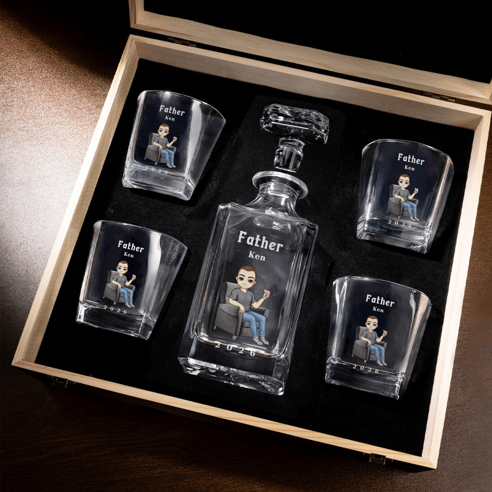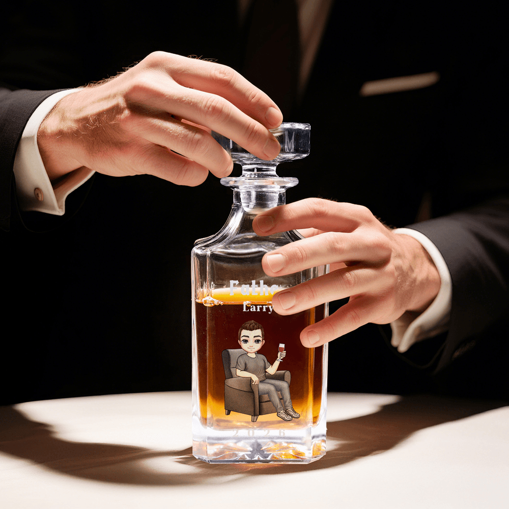 This whiskey decanter features a cartoon character lounging on a sofa printed on the front, blending relaxed elegance with premium quality and sentimental value. The decanter's lines are graceful and smooth, showcasing simple yet refined aesthetics. You can customize it with a unique cartoon figure, making every decanter a one-of-a-kind personalized piece.