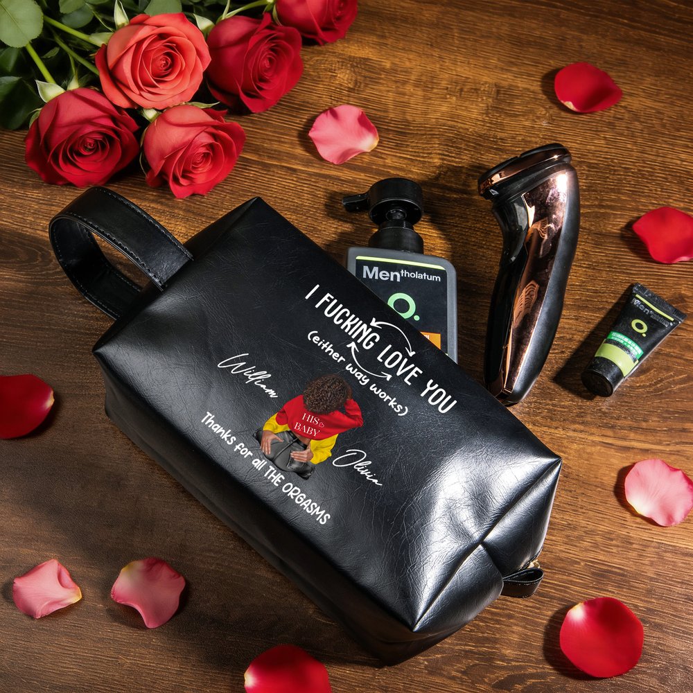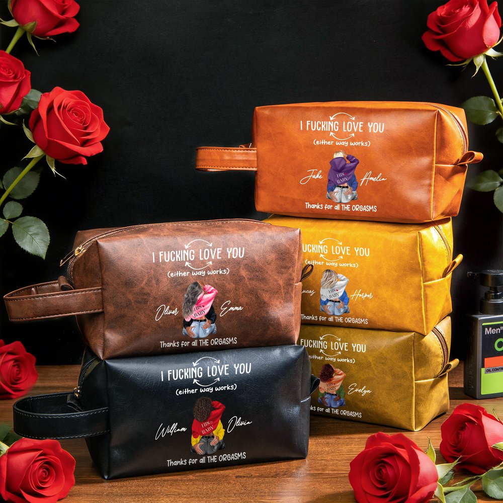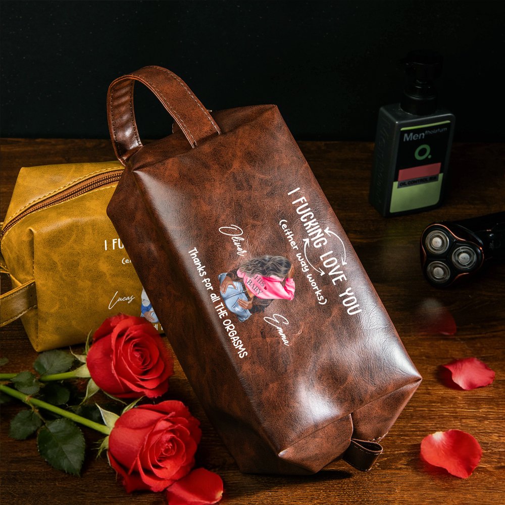 Its PU leather base features a custom cartoon couple illustration paired with cheeky phrases like “I FUCKING LOVE YOU” and “Thanks for all the ORGASMS.” You can customize the cartoon characters’ features and add your names. The look blends casual, rugged PU leather with lighthearted, romantic humor—creating a pouch that’s both functional and full of personality.
