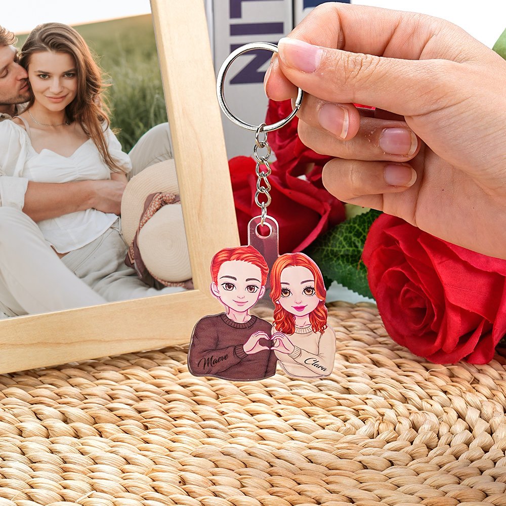 This keychain perfectly captures the sweet moments between lovers, which are both cute and full of emotions. This keychain shows your story in cartoon form, and the heart gesture shape is more sweet and romantic. You can choose different clothes and accessories, and add the names of both parties to make this keychain a true symbol of your love.