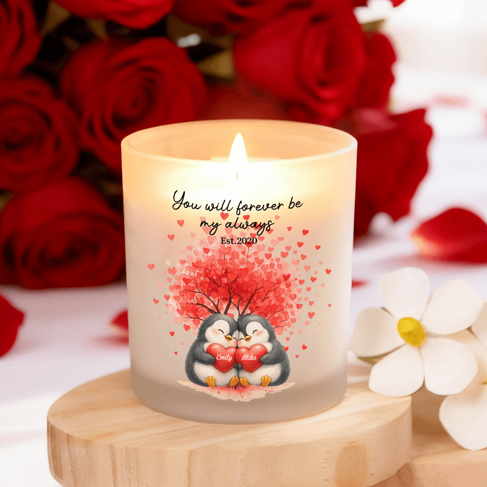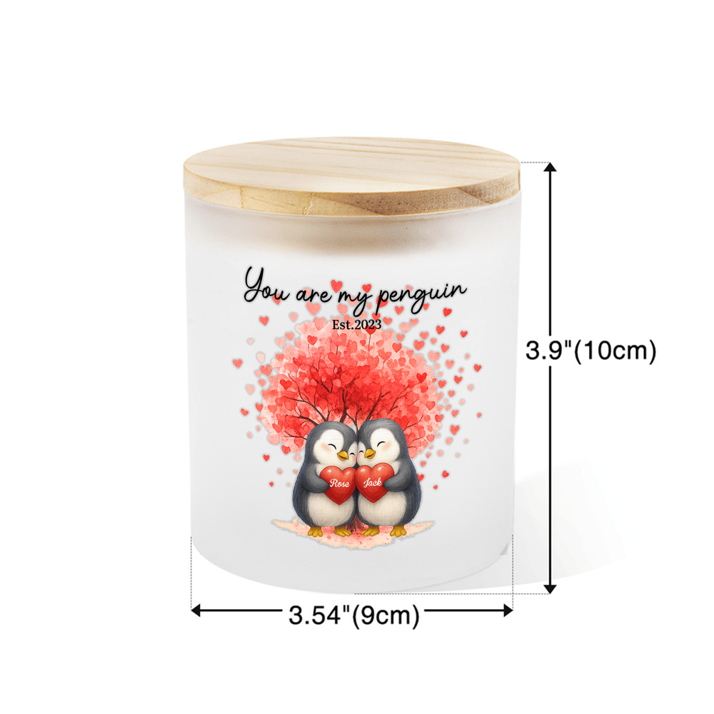 Inspired by romantic symbolism, this candle jar features a sweet penguin couple, a blooming love tree, and scattered heart shapes, representing loyalty, partnership, and lifelong commitment. Personalized with custom names, title, and dates, the design turns a simple decor piece into a meaningful symbol of enduring love.