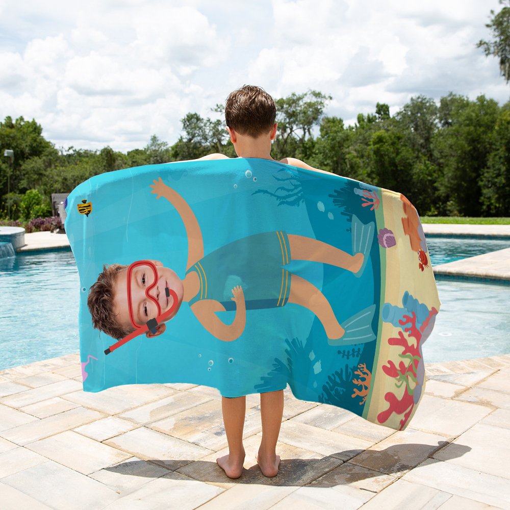 This diving-themed beach towel showcases a playful cartoon diver surrounded by vibrant marine life. With lively colors and charming sea elements—like coral and schools of fish—it sparks children’s imagination and brings the underwater world to life. For a personal touch, the towel can be customized with a child's photo, turning it into a one-of-a-kind accessory they'll love.
