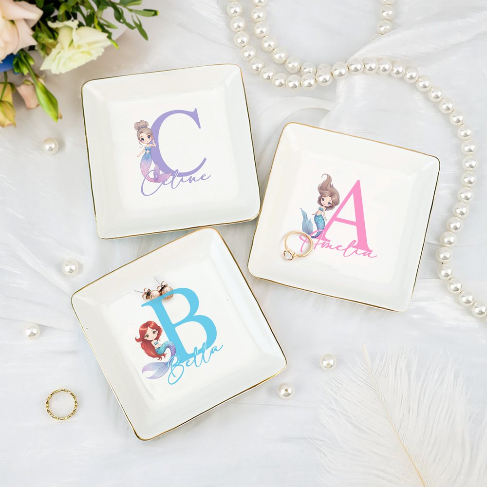 Mermaid girls symbolize freedom and mystery and are often seen as the embodiment of beautiful girls. Our jewelry plate is inspired by this, and you can choose from 3 different forms of mermaids. It combines perfectly with initials and provides the option of personalized names, so that every girl can have a unique jewelry plate.