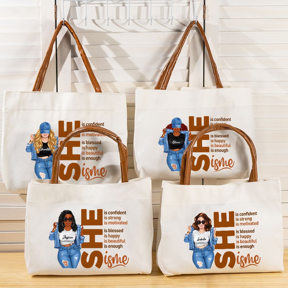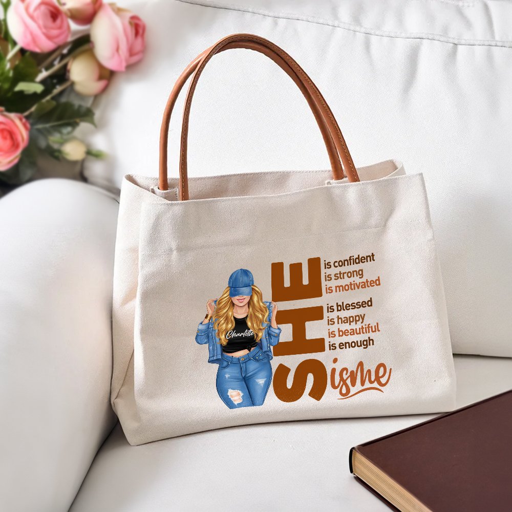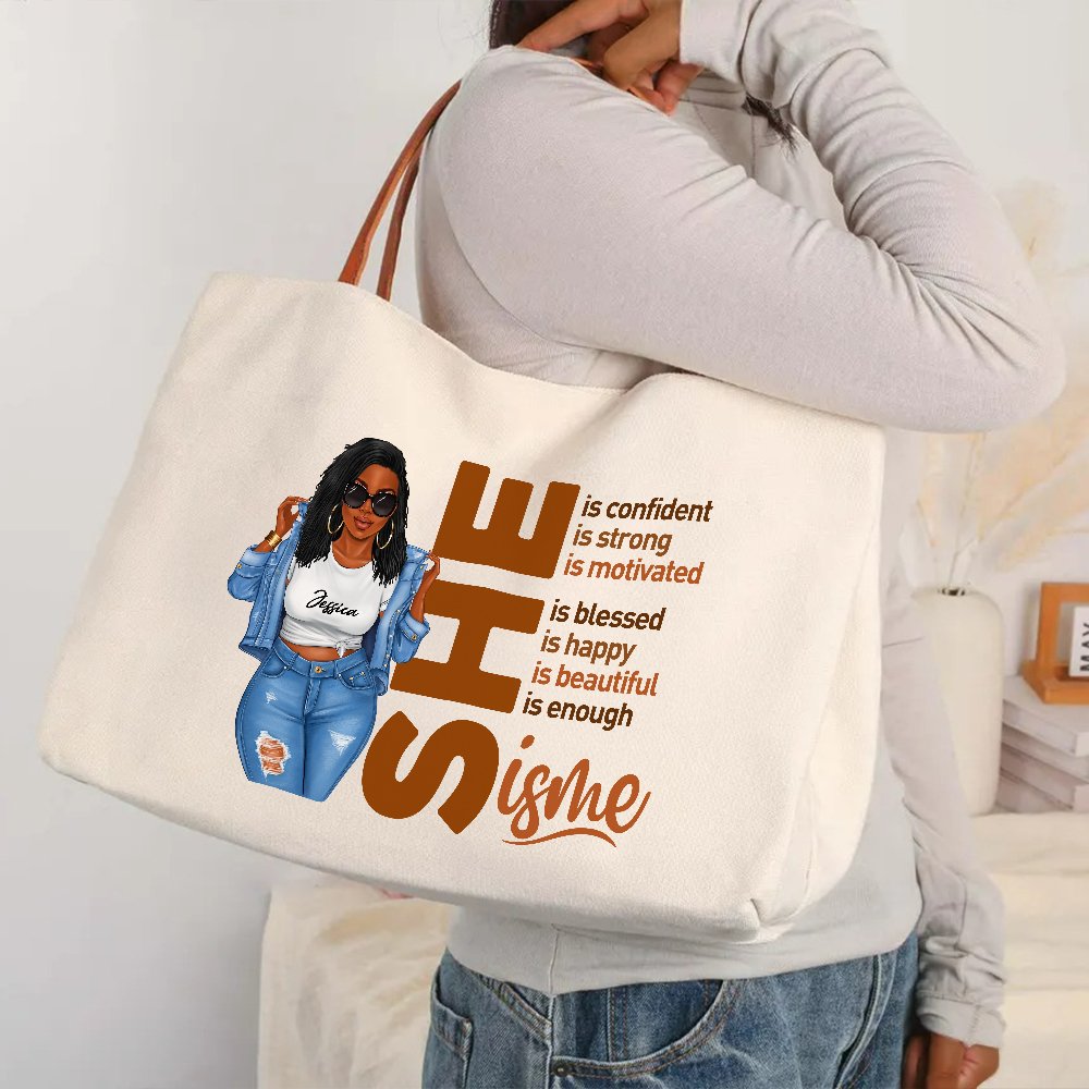 This unique canvas tote bag features a cartoon female character in a stylish denim outfit, exuding confidence and vitality. A very contagious text accompanies the surrounding area: "I am confident, strong, motivated, blessed, happy, beautiful, enough." This design shows confidence and strength. The name can also be customized on the bag, which not only adds a sense of exclusivity but also allows the user to have a unique experience, full of fun and uniqueness.