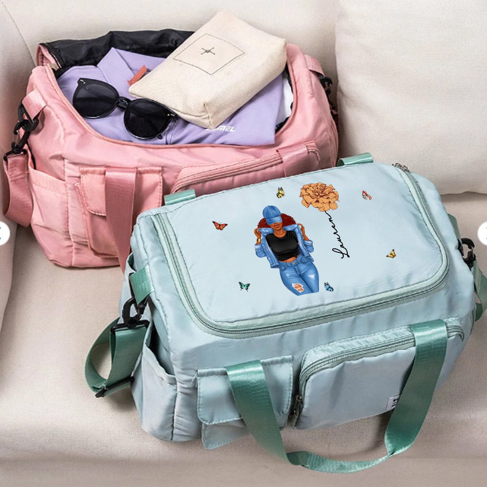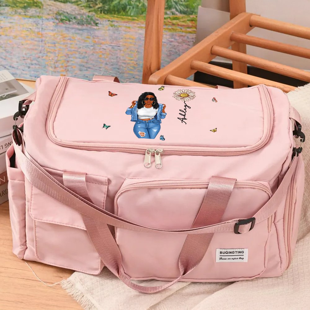 This travel bag features a cartoon woman in a stylish denim outfit, showing confidence and vitality. She is surrounded by birthday flowers and butterfly patterns, paired with a customizable name, adding a sense of exclusivity and fun.