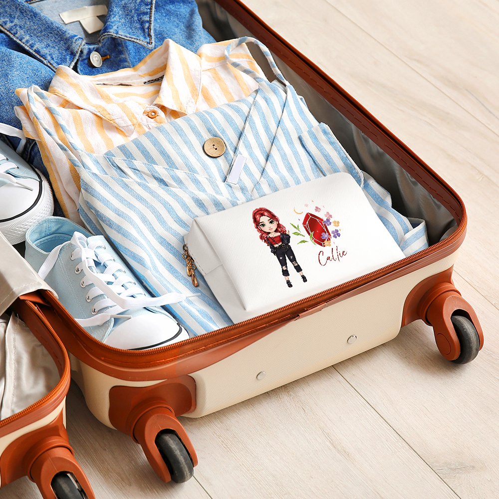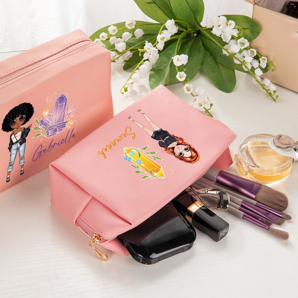 This makeup bag's design is unique and carefully printed with different styles of fashionable girl clip art. The birthstone patterns, interspersed with the moon, stars, and colorful flowers, make the design more mysterious and romantic. The jewelry dish can also be printed with a name, making it a unique piece of art.