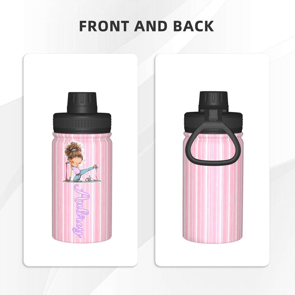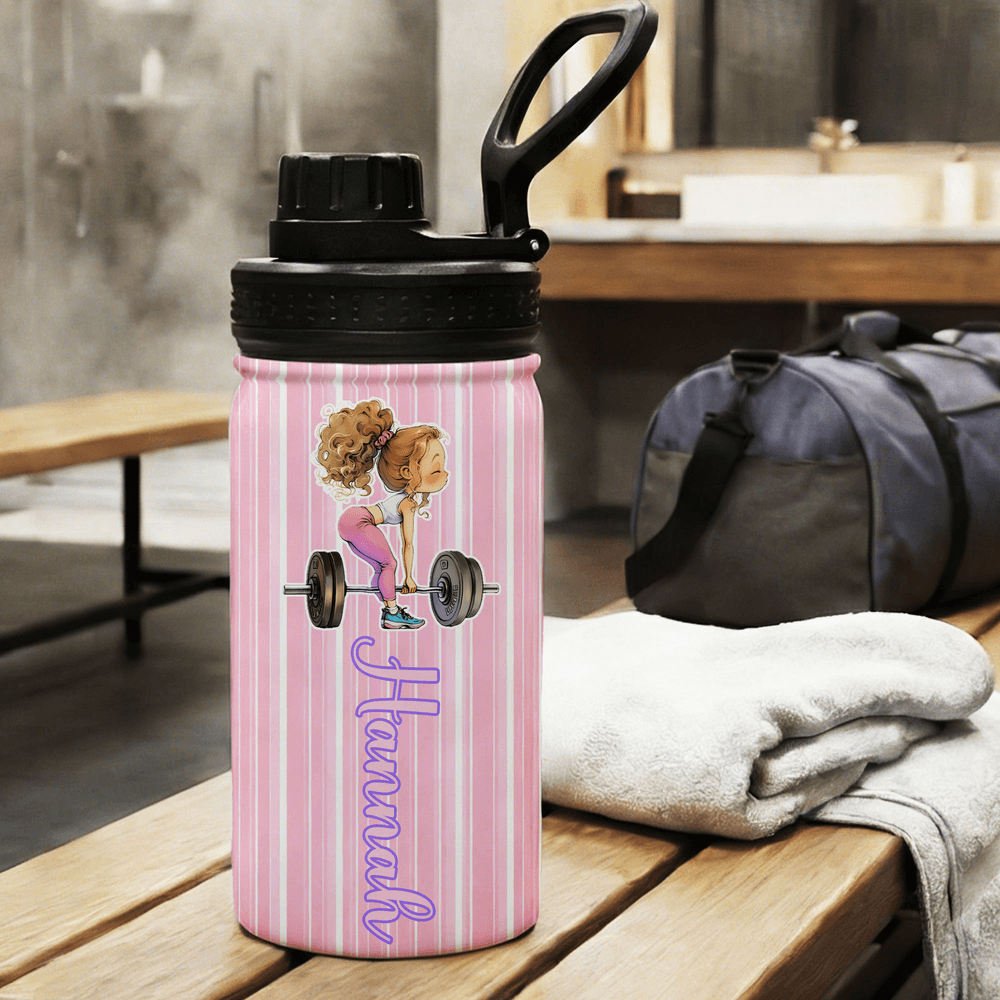 Personalized Cartoon Fitness Girl Vertical Stripe 12 oz/18 oz Insulated Water Bottle with Name Birthday Gift for Women Fitness Lovers
