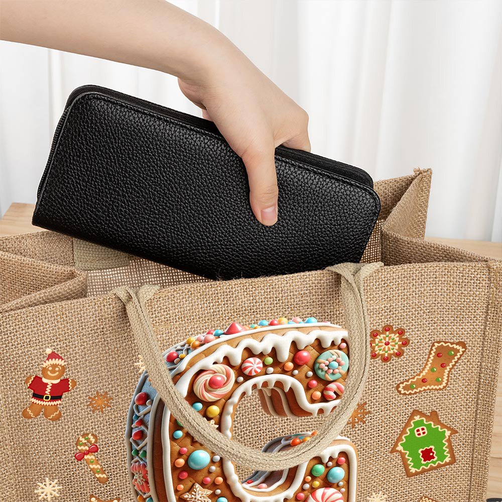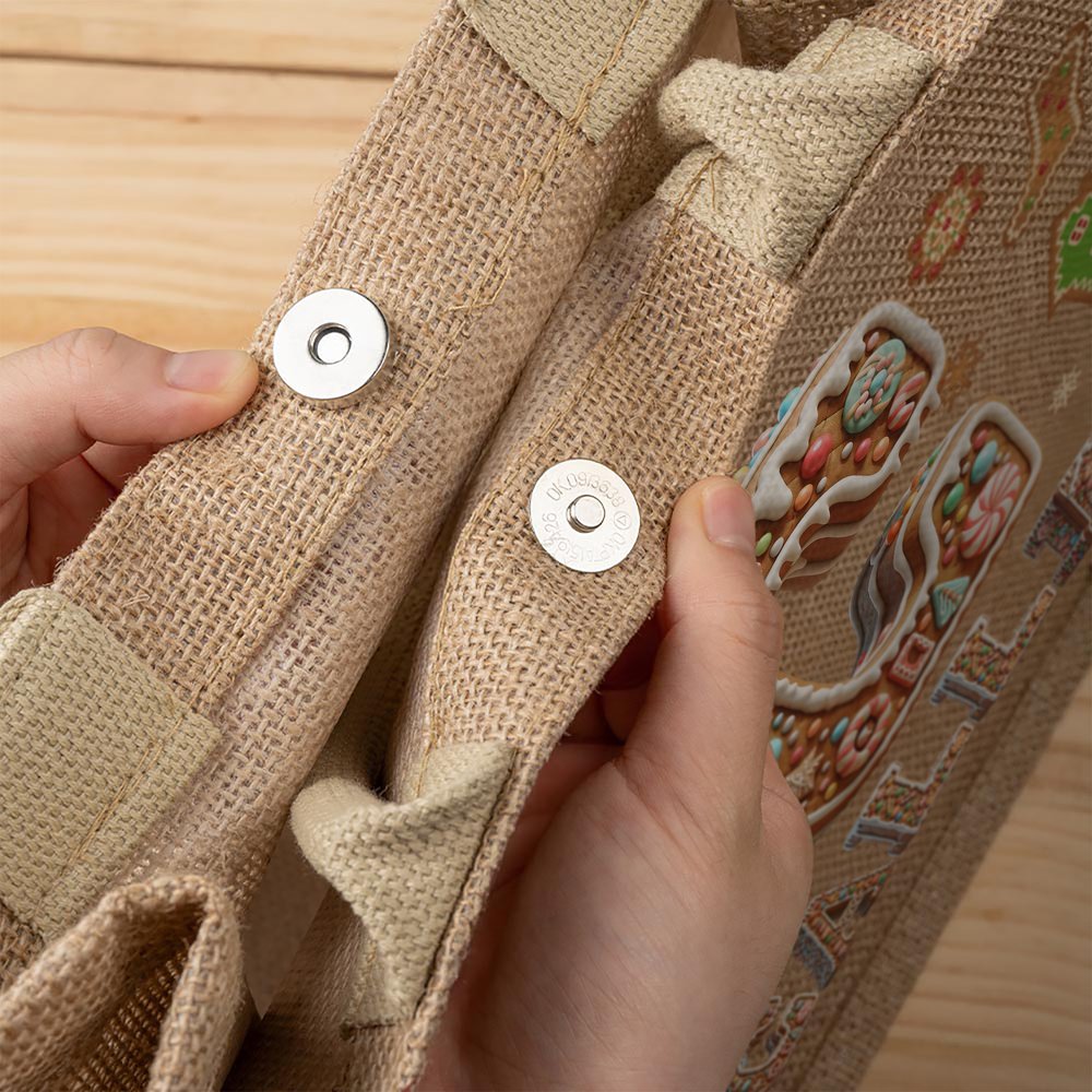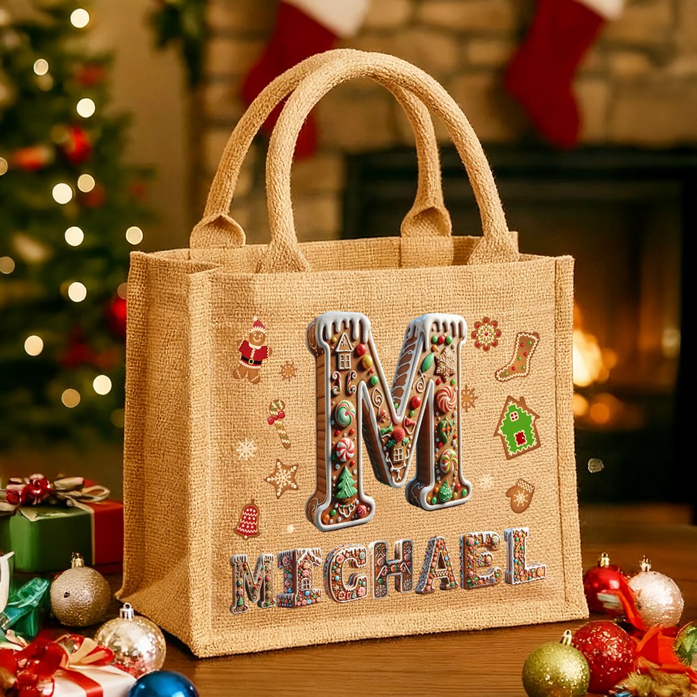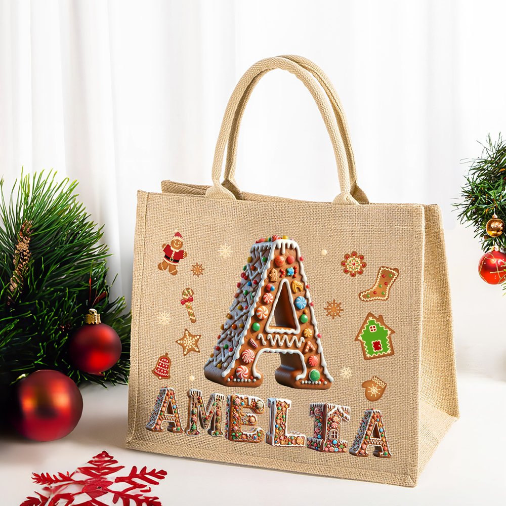 This jute bag is inspired by adorable cartoon gingerbread candies, featuring lively cartoon gingerbread and colorful candy patterns. Its unique cartoon style, combined with the ability to customize your name, instantly creates a festive atmosphere, making every use joyful and warm, a perfect finishing touch for your Christmas season and daily life.