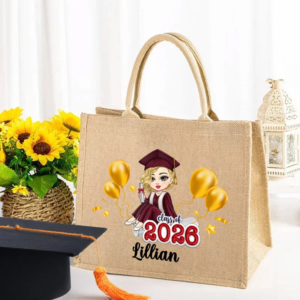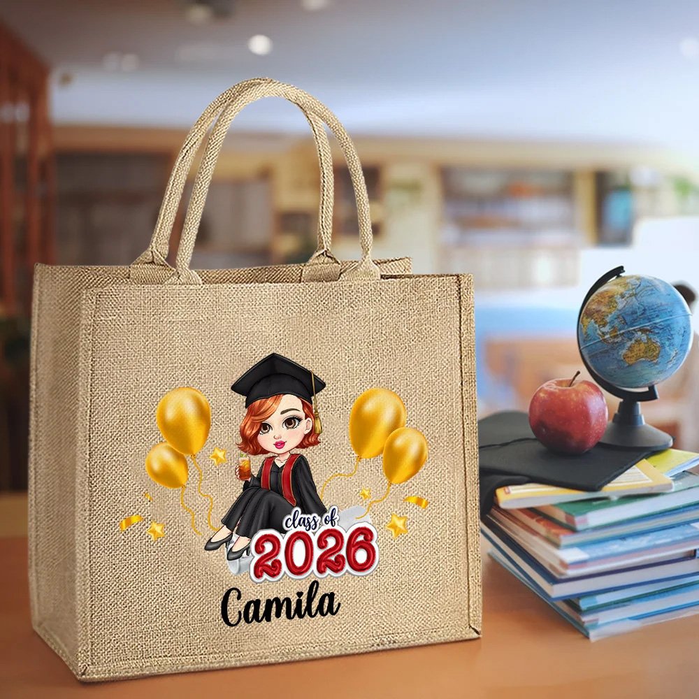 This bag features a cute cartoon graduate and a gold balloon background. You can customize a graduate's name and graduation year to create a unique and meaningful accessory that shows your personality.