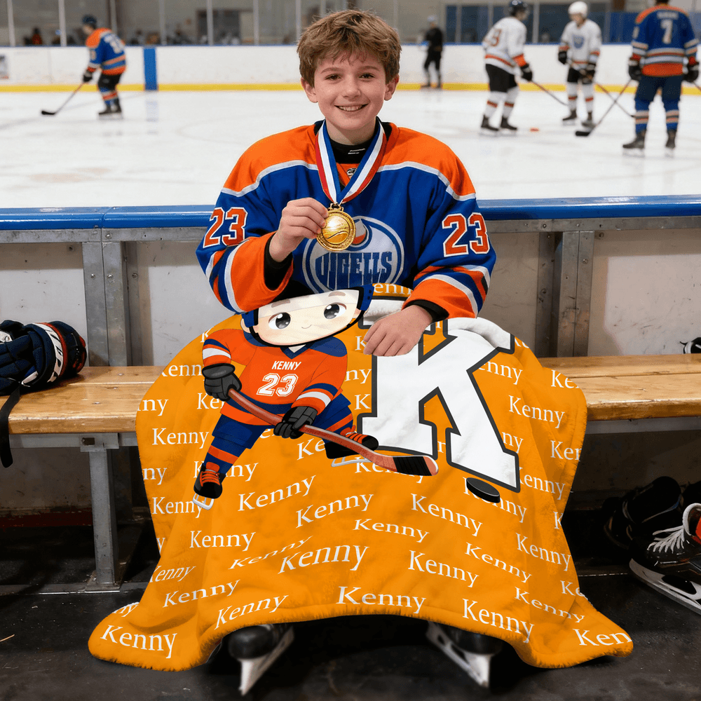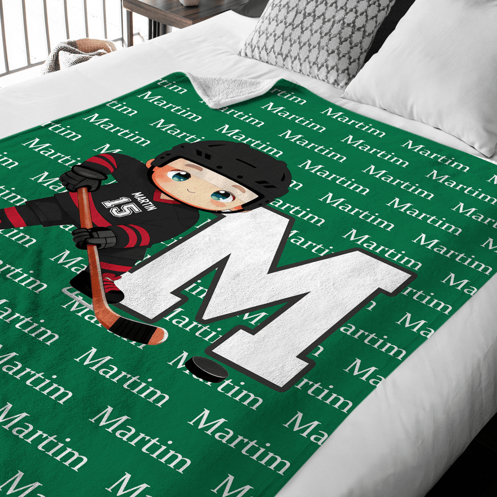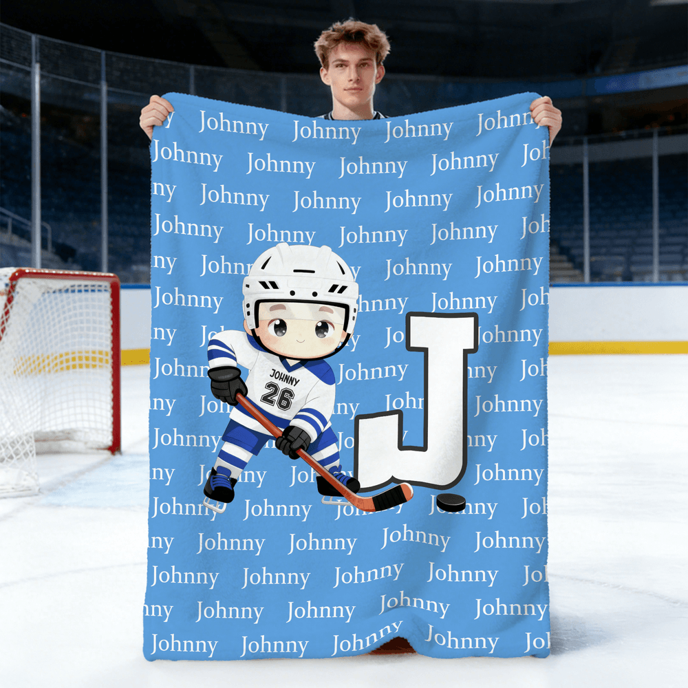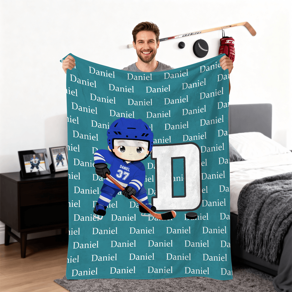 This blanket features a vibrant and playful cartoon hockey player design, capturing the athlete's dynamic pose while playing. It can be customized with your choice of name and number, along with a unique word cloud design that enhances the adorable cartoon figures. This creates a distinct style for each sports enthusiast, expressing individuality and passion while conveying encouragement and well-wishes to athletes.